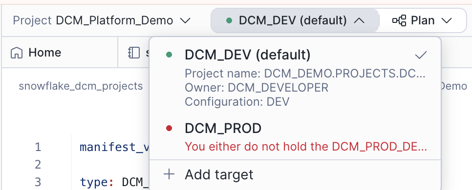 USE ROLE dcm_developer; CREATE DATABASE IF NOT EXISTS dcm_demo; CREATE SCHEMA IF NOT EXISTS dcm_demo.projects; CREATE DCM PROJECT IF NOT EXISTS dcm_demo.projects.dcm_platform_dev COMMENT = 'for DCM Platform Demo - Quickstart 2';