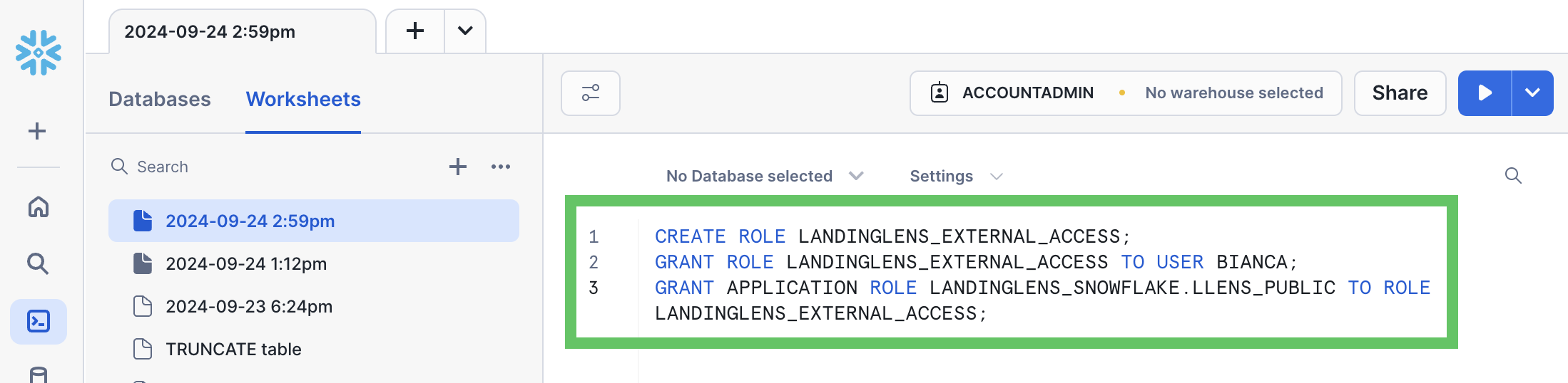 Application roles can't be granted directly to users, so you must grant LLENS_PUBLIC to an account role (or to another application role that is then granted to an account role). In this tutorial, you will create an account role called LANDINGLENS_EXTERNAL_ACCESS, grant that role to yourself, and then grant the LLENS_PUBLIC application role to that account role.