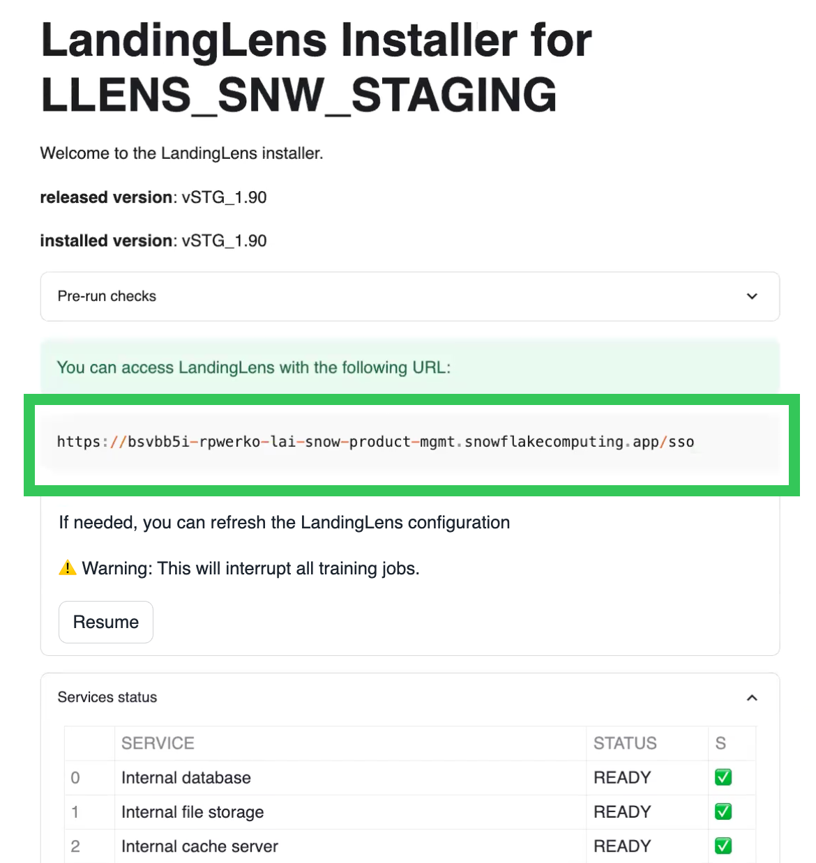 Once the installation process is complete, all services have the status DONE or READY (green checkmark) and the URL to access LandingLens displays. Copy and paste the URL.