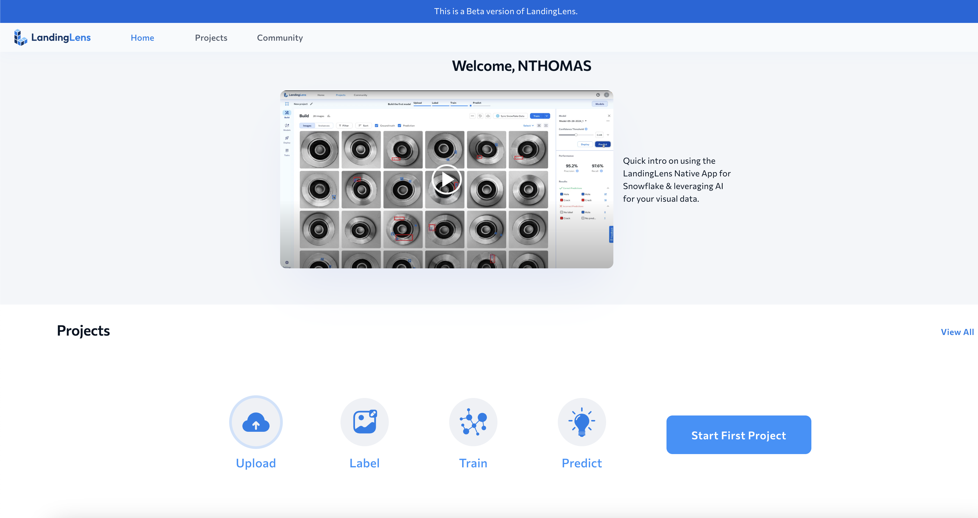 Paste the URL into a new tab to open the LandingLens app. We recommend bookmarking this URL. You can log in to the app using the Snowflake credentials you used to install the app. Only users with the correct privileges in the account can access the LandingLens app.