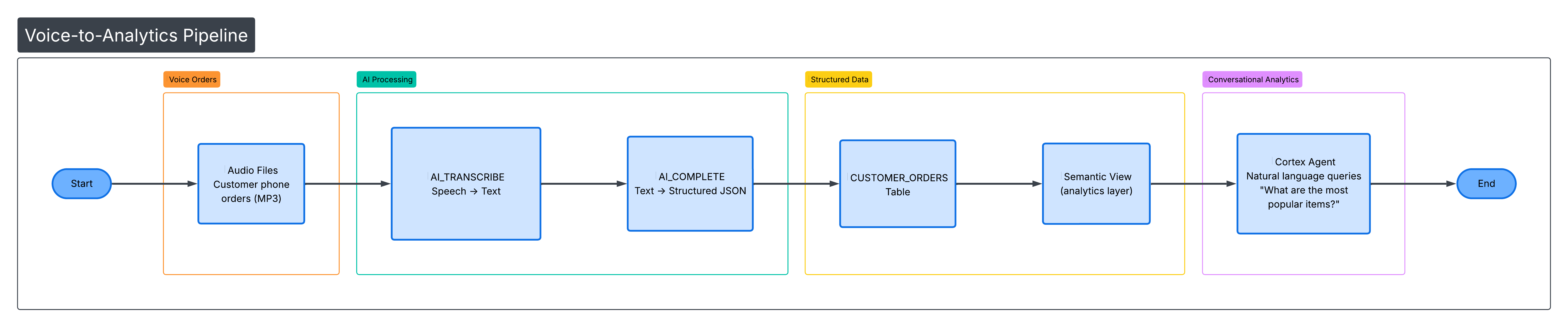 TastyBytes, a fictional food truck network, is modernizing their phone ordering system. In this guide, you'll build an end-to-end voice order processing pipeline that goes from raw audio recordings to structured order data to conversational analytics — all within Snowflake.