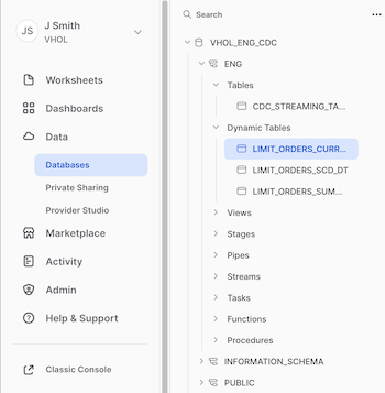First, lets look at the properties page for a Dynamic Table, from the left-side menu, navigate to "Data, Databases>VHOL_ENG_CDC, ENG schema, Dynamic Tables" and click one of the Dynamic Tables you created.