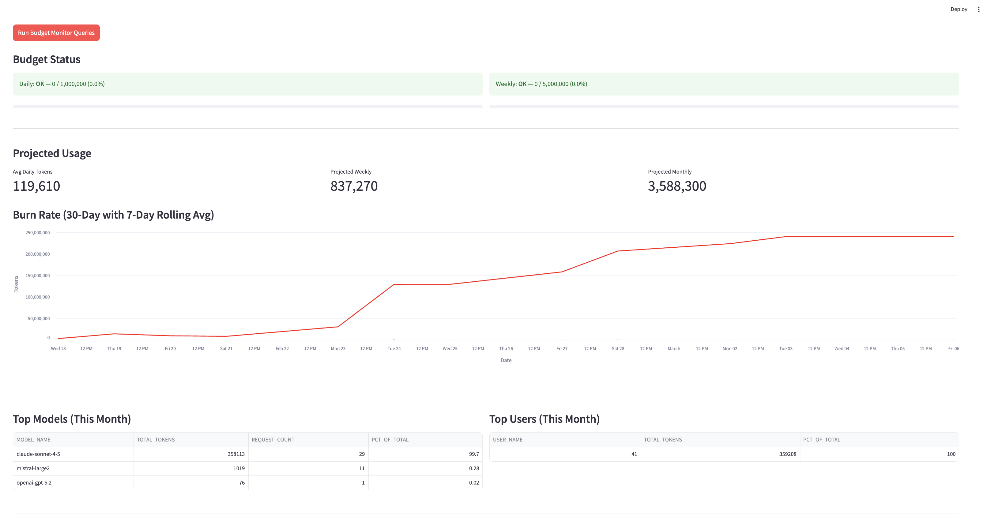 /budget-status— daily and weekly budget snapshot/burn-rate— latest burn, 7-day rolling average, projections/alerts— 30-day rolling alerts table/budget-summary— combined view of all budget metrics