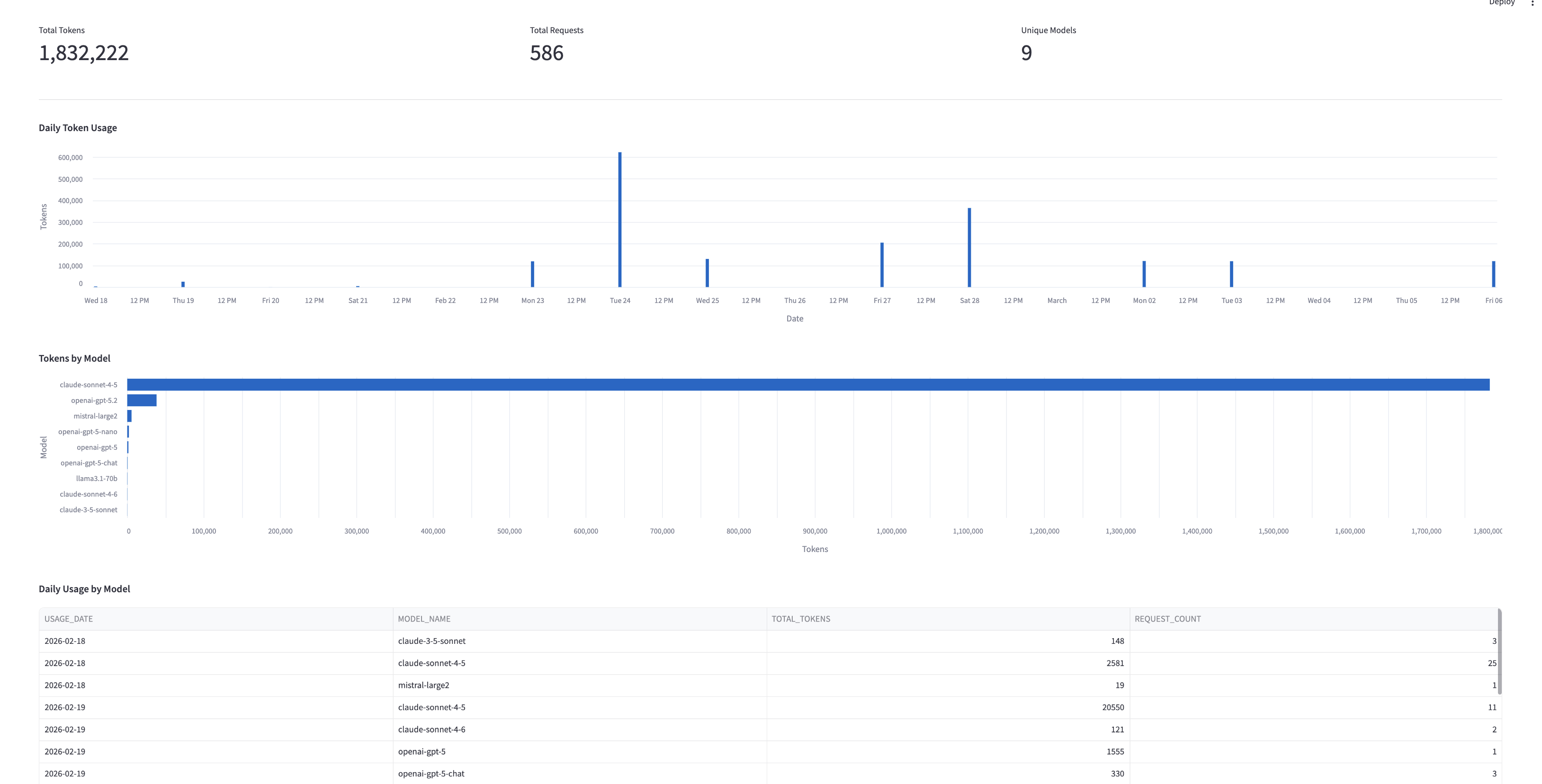 SELECT SUM(TOKENS) as TOTAL_TOKENS, COUNT(*) as TOTAL_REQUESTS, COUNT(DISTINCT MODEL_NAME) as UNIQUE_MODELS FROM SNOWFLAKE.ACCOUNT_USAGE.CORTEX_REST_API_USAGE_HISTORY WHERE START_TIME >= :start_date