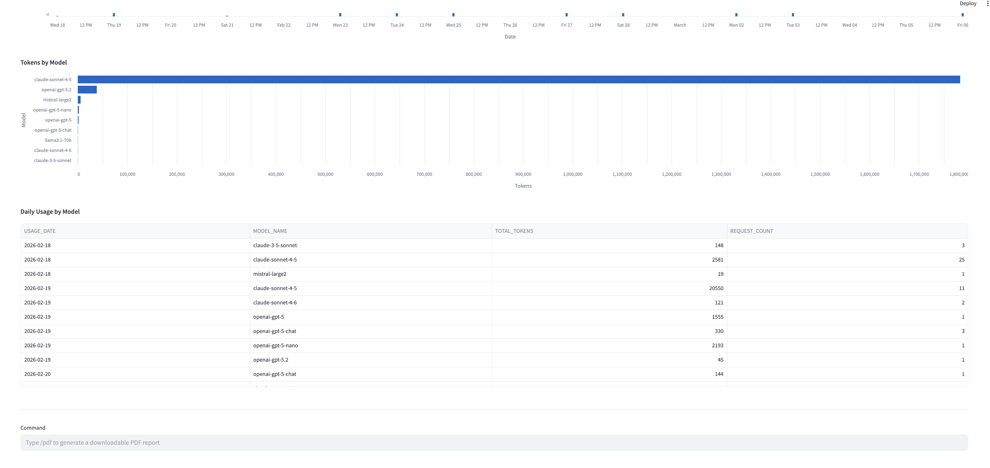Type /pdf in the command bar at the bottom of Tab 1 to generate a downloadable PDF report from the queried data. The PDF includes KPI summary, daily usage chart, model chart, and a daily-by-model table.