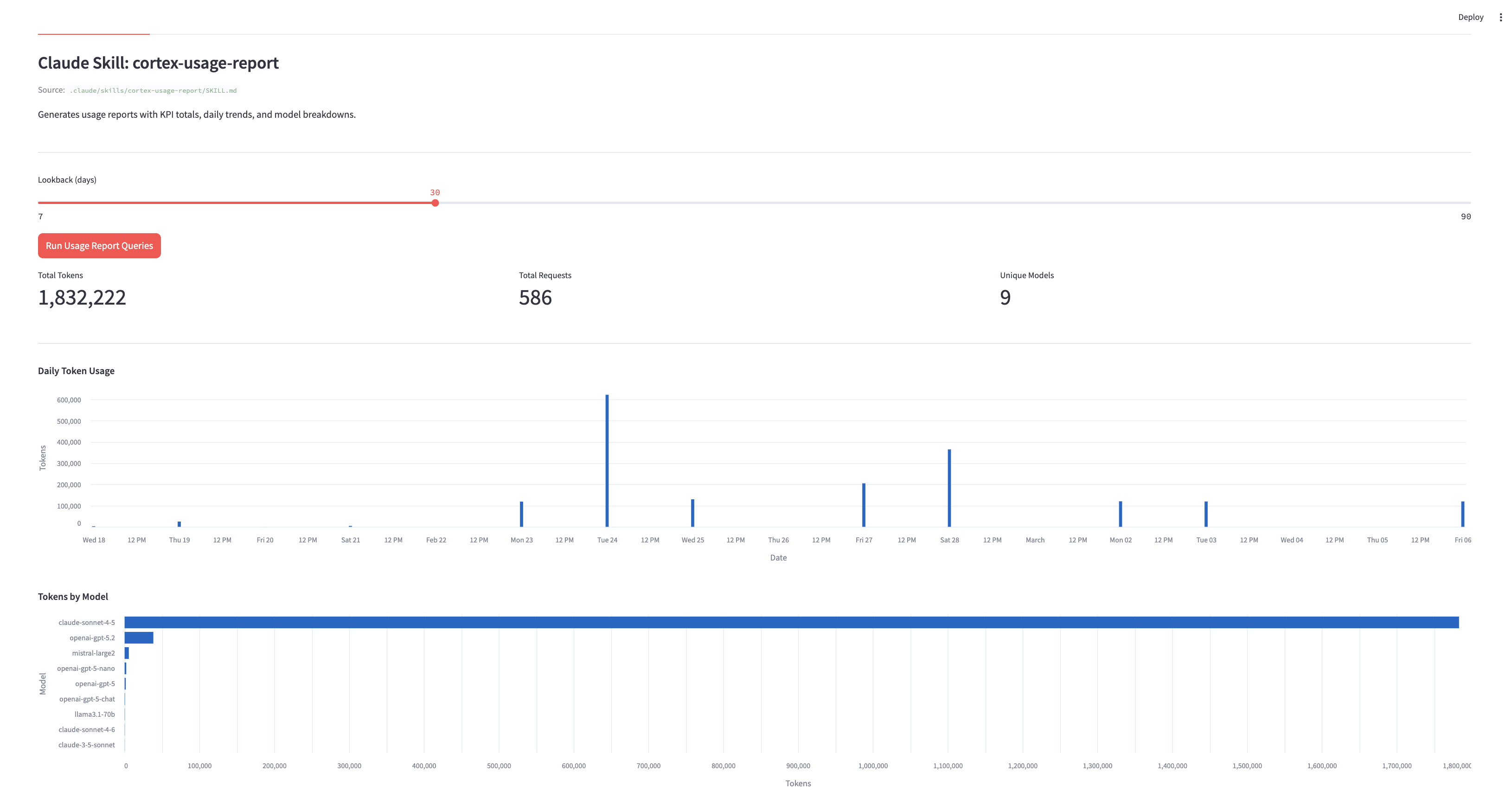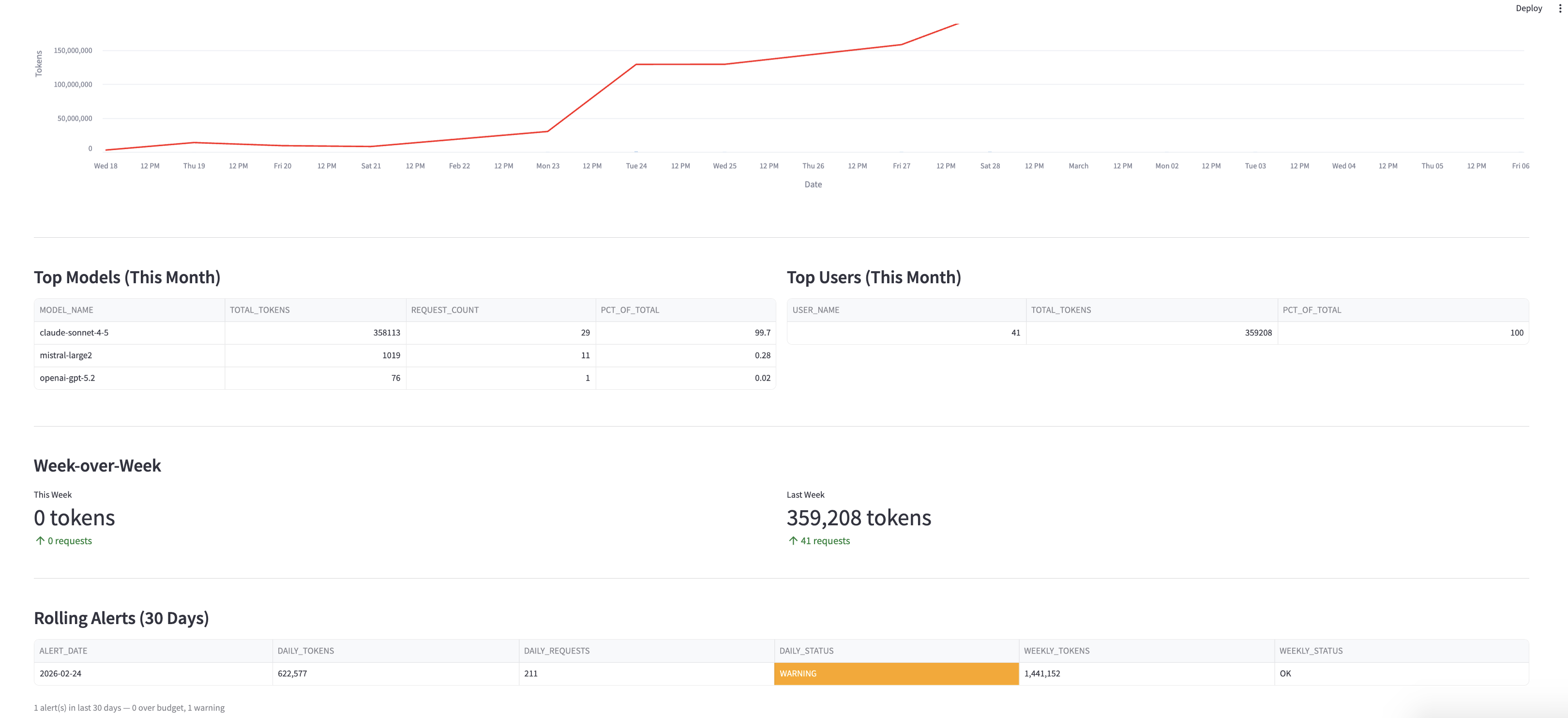 SNOWFLAKE.ACCOUNT_USAGE.CORTEX_REST_API_USAGE_HISTORY │ ├── Claude Skill (Tab 1) │ ├── KPI Totals (tokens, requests, models) │ ├── Daily Token Usage chart │ ├── Tokens by Model chart │ ├── Daily Usage by Model table │ └── /pdf command → PDF report (reportlab + matplotlib) │ └── CoCo Skill (Tab 2) ├── Daily/Weekly Budget Status (OK / WARNING / OVER BUDGET) ├── Projected Usage (daily avg, weekly, monthly) ├── Burn Rate chart (30-day with 7-day rolling avg) ├── Top Models & Top Users ├── Week-over-Week comparison └── Rolling Alerts table (30-day breach history)