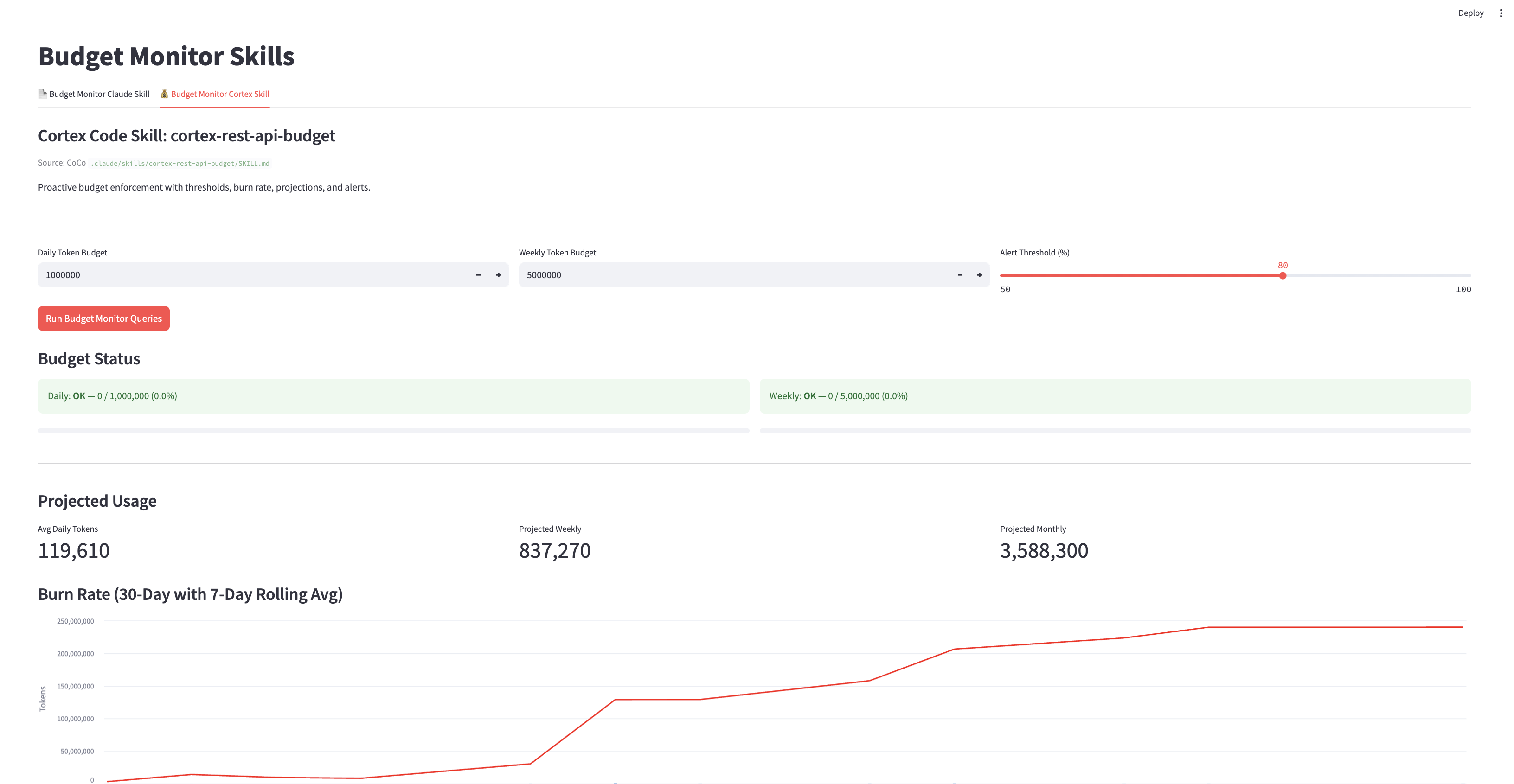 You have built a Cortex REST API budget monitoring dashboard using two complementary Cortex Code skill approaches: