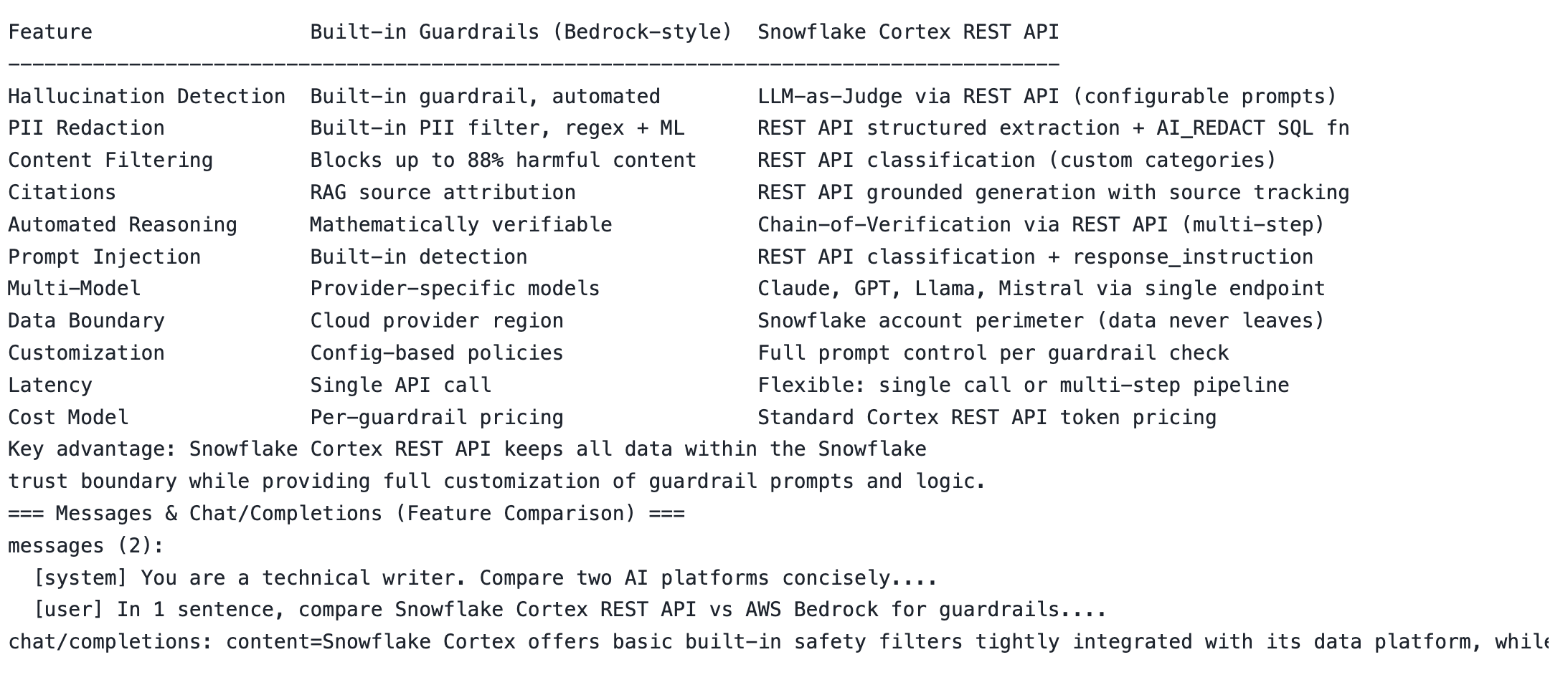 | AWS Bedrock Guardrails | Snowflake Cortex REST API Equivalent |