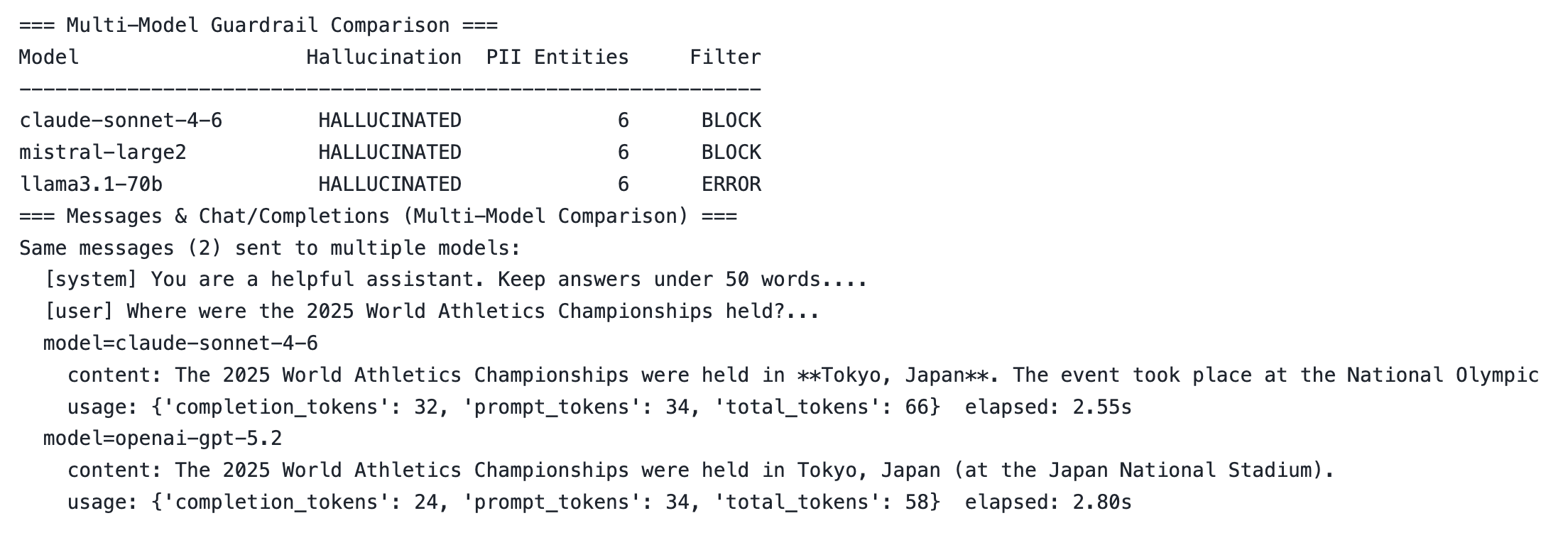 The choices[0].messages field contains the LLM's text response. For guardrails, we instruct the model to return structured JSON, then parse it with parse_llm_json().