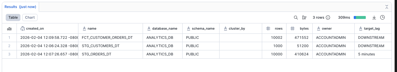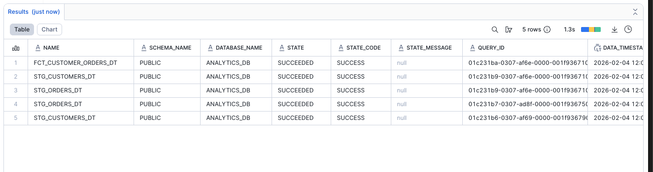Database Explorer>ANALYTICS_DB>PUBLIC>Dynamic Tables>FCT_CUSTOMER_ORDERS_DT - Click on "Refresh History" to see a table showing when the Dynamic Table was refreshed and the status of each refresh