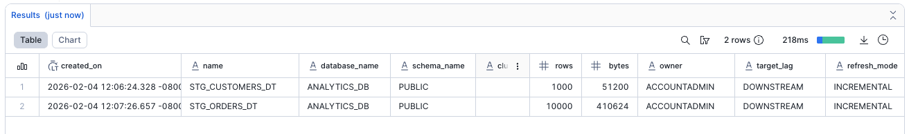 use role accountadmin; use warehouse compute_wh; use database analytics_db; show dynamic tables;
