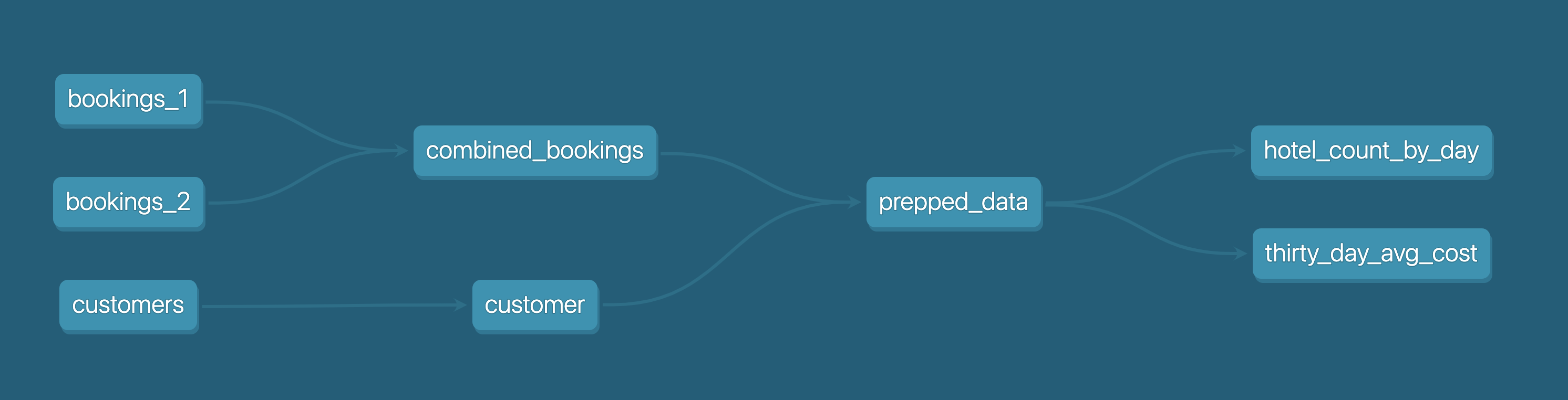 Come illustrato nel diagramma qui sotto, abbiamo tre file CSV: bookings_1, bookings_2 e customers . Utilizzeremo questi file CSV per il seeding in Snowflake inserendoli come tabelle. Questo sarà spiegato nei dettagli nel passaggio 4.