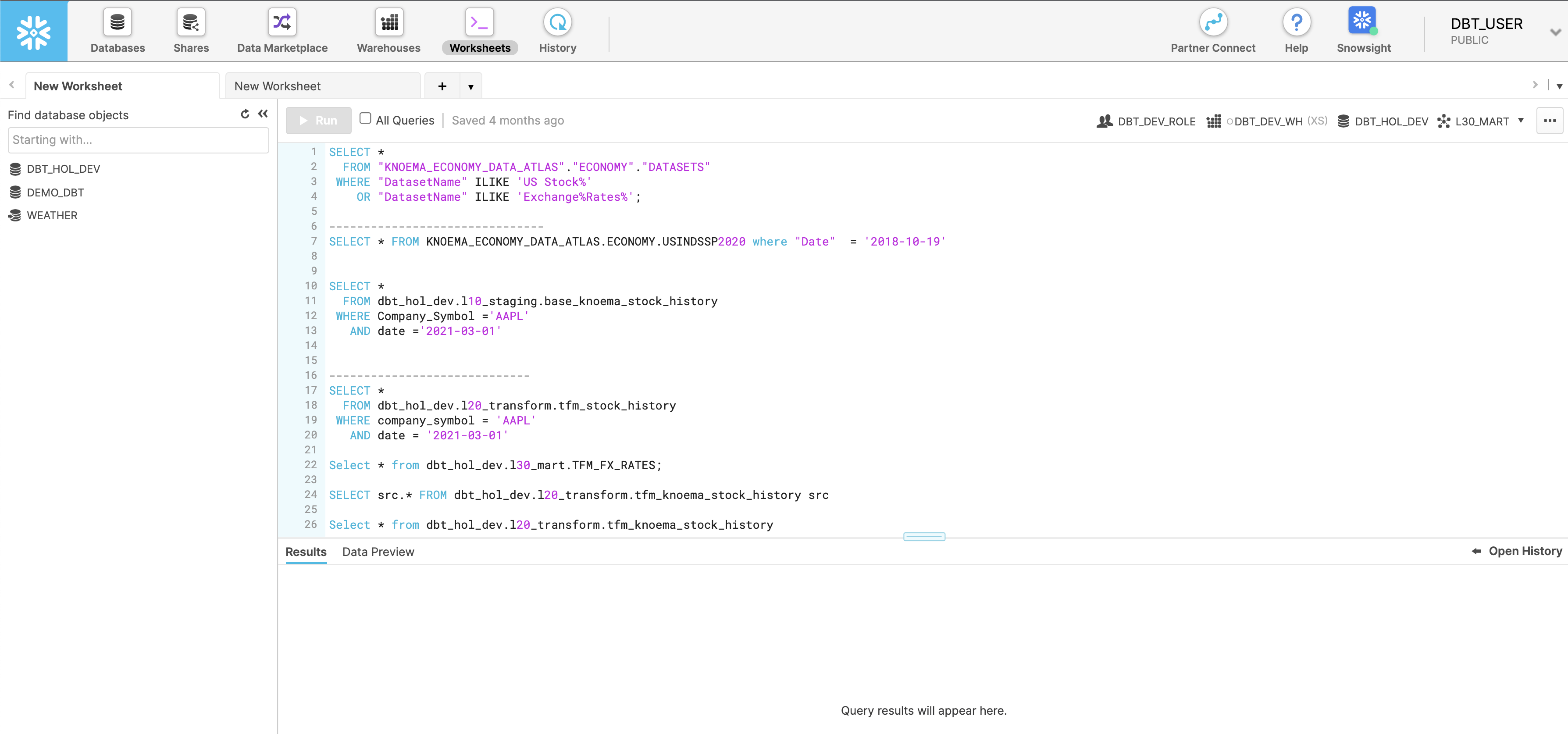 USE ROLE SECURITYADMIN; CREATE OR REPLACE ROLE dbt_DEV_ROLE COMMENT='dbt_DEV_ROLE'; GRANT ROLE dbt_DEV_ROLE TO ROLE SYSADMIN; CREATE OR REPLACE USER dbt_USER PASSWORD='<PASSWORD>' DEFAULT_ROLE=dbt_DEV_ROLE DEFAULT_WAREHOUSE=dbt_WH COMMENT='dbt User'; GRANT ROLE dbt_DEV_ROLE TO USER dbt_USER; -- Grant privileges to role USE ROLE ACCOUNTADMIN; GRANT CREATE DATABASE ON ACCOUNT TO ROLE dbt_DEV_ROLE; /*--------------------------------------------------------------------------- Next we will create a virtual warehouse that will be used ---------------------------------------------------------------------------*/ USE ROLE SYSADMIN; --Create Warehouse for dbt work CREATE OR REPLACE WAREHOUSE dbt_DEV_WH WITH WAREHOUSE_SIZE = 'XSMALL' AUTO_SUSPEND = 120 AUTO_RESUME = true INITIALLY_SUSPENDED = TRUE; GRANT ALL ON WAREHOUSE dbt_DEV_WH TO ROLE dbt_DEV_ROLE;