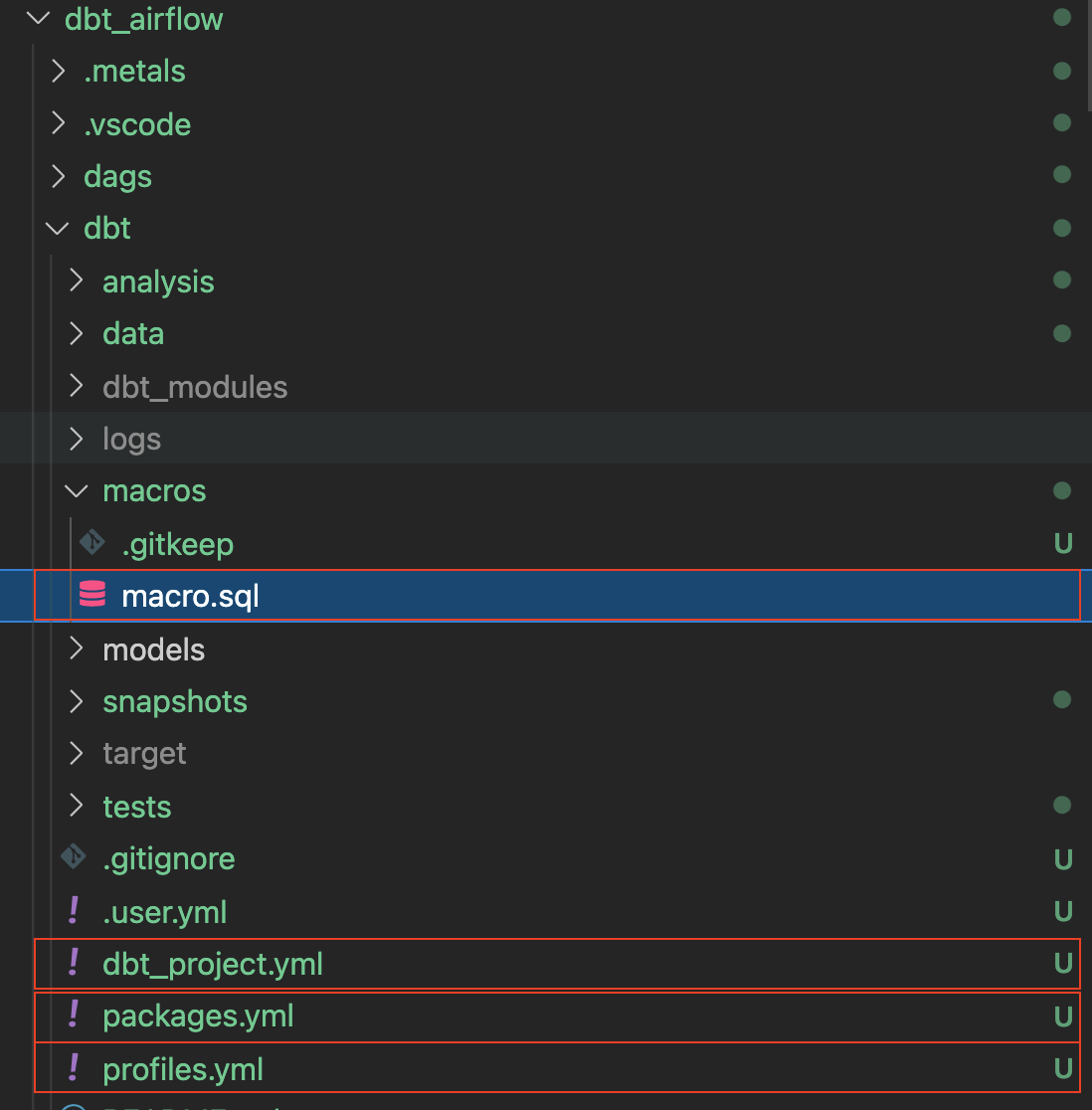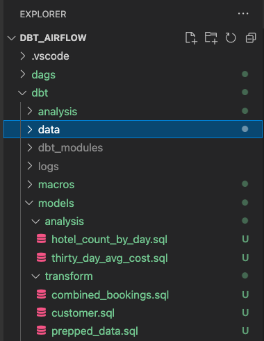 La struttura dei file dovrebbe essere come illustrato sotto. Abbiamo già completato i modelli dbt e possiamo iniziare a lavorare con Airflow.