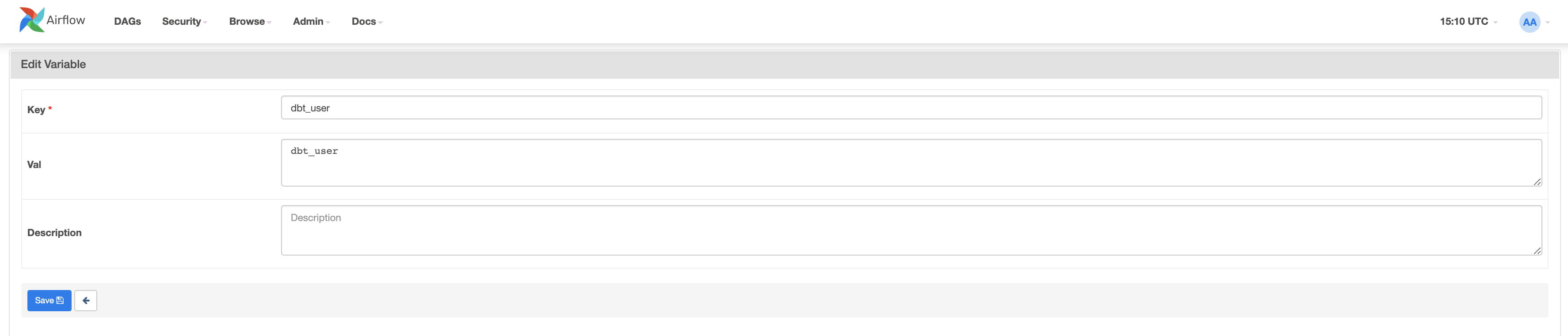 Per prima cosa creiamo la chiave dbt_user e il valore dbt_user.