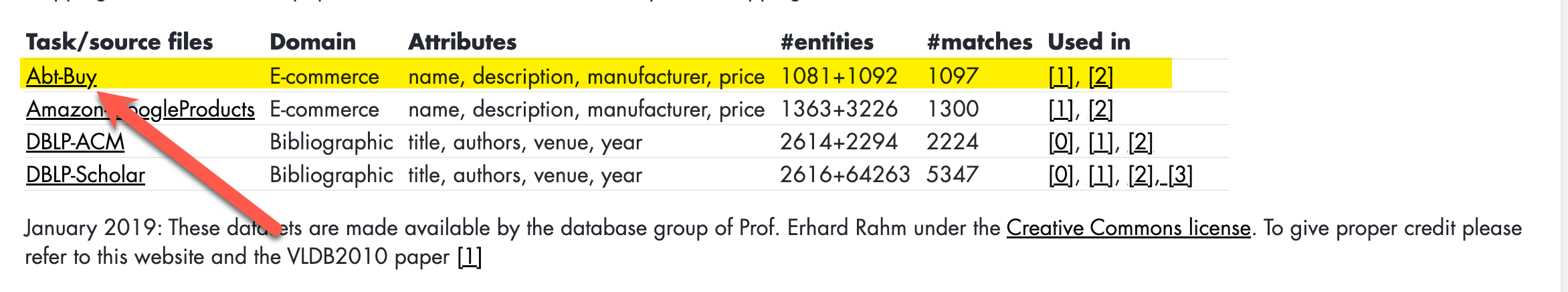 The datasets used in this quickstart are commonly used data harmonization test datasets. These datasets are made available by the database group of Prof. Erhard Rahm under the Creative Commons license. Column titles are changed at the table level from the original CSV files.