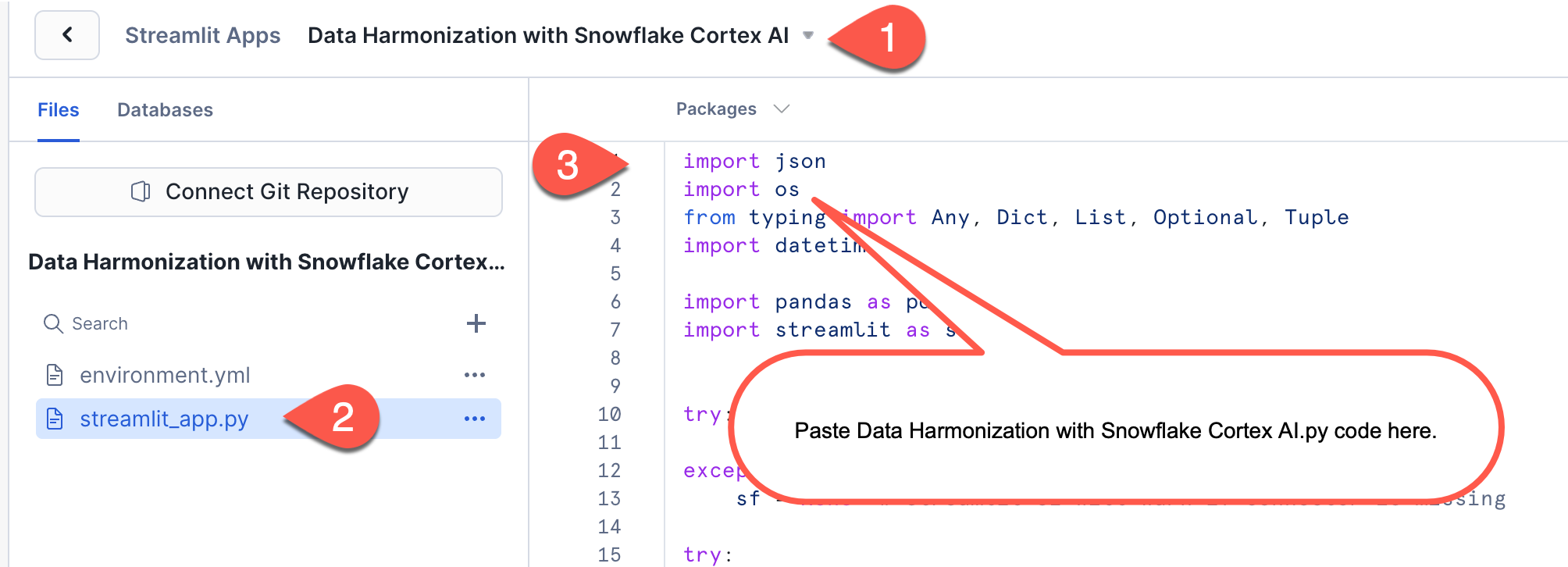 Data Harmonization with Snowflake Cortex AI.pyinto this file - Be sure you install the appropriate packages