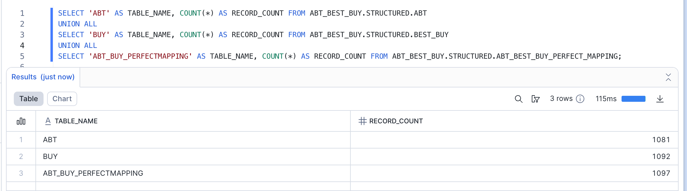 -- Check ABT table SELECT 'ABT' AS TABLE_NAME, COUNT(*) AS RECORD_COUNT FROM ABT_BEST_BUY.STRUCTURED.ABT UNION ALL SELECT 'BUY' AS TABLE_NAME, COUNT(*) AS RECORD_COUNT FROM ABT_BEST_BUY.STRUCTURED.BEST_BUY UNION ALL SELECT 'ABT_BUY_PERFECTMAPPING' AS TABLE_NAME, COUNT(*) AS RECORD_COUNT FROM ABT_BEST_BUY.STRUCTURED.ABT_BEST_BUY_PERFECT_MAPPING; -- Preview sample records from each table SELECT 'ABT Sample' AS SOURCE, * FROM ABT_BEST_BUY.STRUCTURED.ABT LIMIT 100; SELECT 'BUY Sample' AS SOURCE, * FROM ABT_BEST_BUY.STRUCTURED.BEST_BUY LIMIT 100; SELECT 'Mapping Sample' AS SOURCE, * FROM ABT_BEST_BUY.STRUCTURED.ABT_BEST_BUY_PERFECT_MAPPING LIMIT 100;