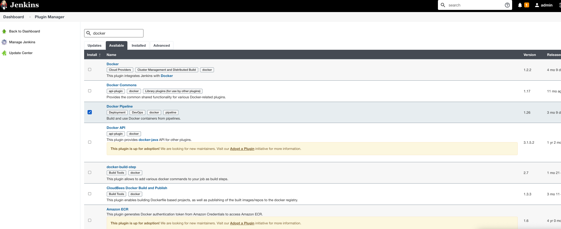 From the Plugin Manager click on the "Available" tab and enter docker pipeline in the search box. You should see one result called "Docker Pipeline". Check the box under this "Install" column next to this plugin and then click on the Install without restart button: