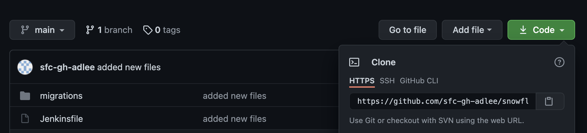 HTTPSlink provided near the top of the page. If you have at least one file in your repository then click on the greenCodeicon near the top of the page and copy theHTTPSlink. Use that link in VS Code or your favorite IDE to clone the repo to your computer. - Docker