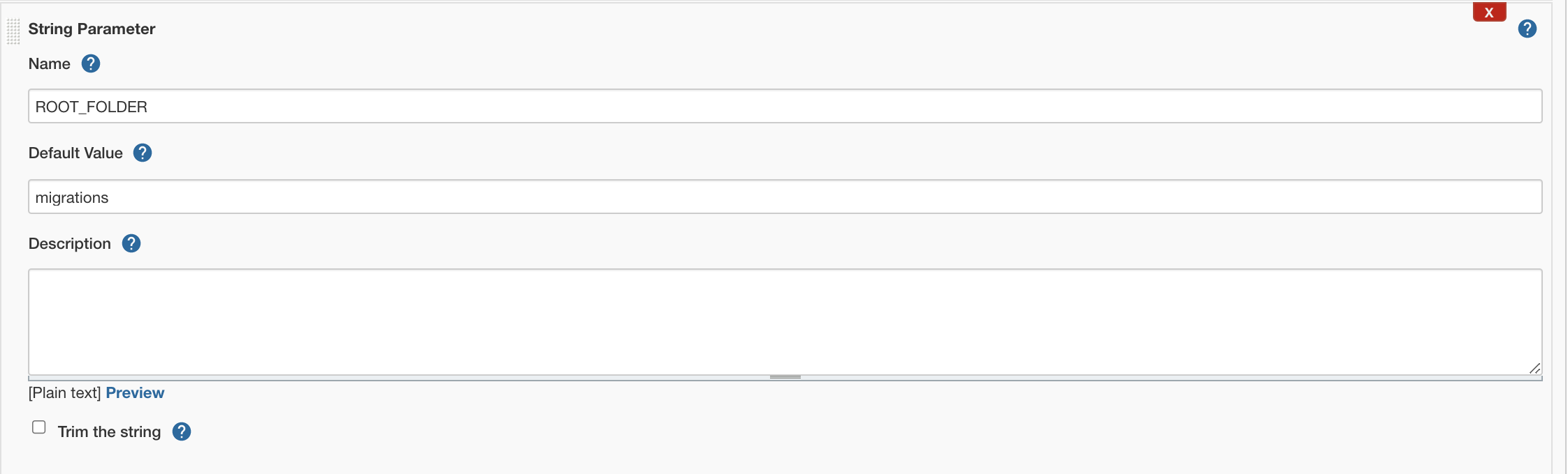 If you don't still have it open, open up your snowflake-devops-demo job and click on Configure in the left navigation bar. Under the "General" settings click the This project is parameterised option. For each parameter listed below click on the Add Parameter button and enter the name given below along with the appropriate value. The parameter entry screen (for each parameter) will look like this: