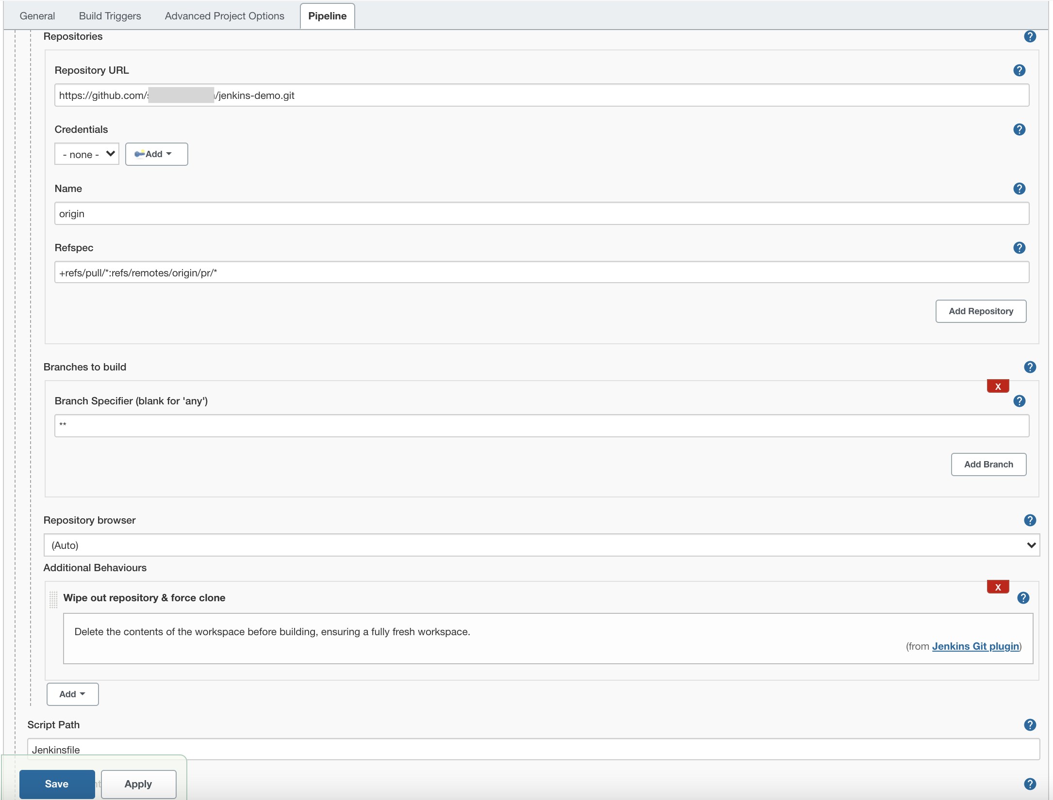 Make sure you don't miss step #5, you have to click on the "Add" button under "Additional Behaviours" and then select "Wipe out repository & force clone". This is an important step as it ensures that your Jenkins pipeline will always be working with the latest version of your repository.
