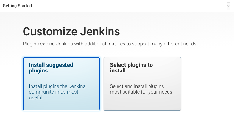 Next you will see the "Customize Jenkins" set up screen. Click on the Install suggested plugins button as shown below and wait for all the suggested plugins to be installed.