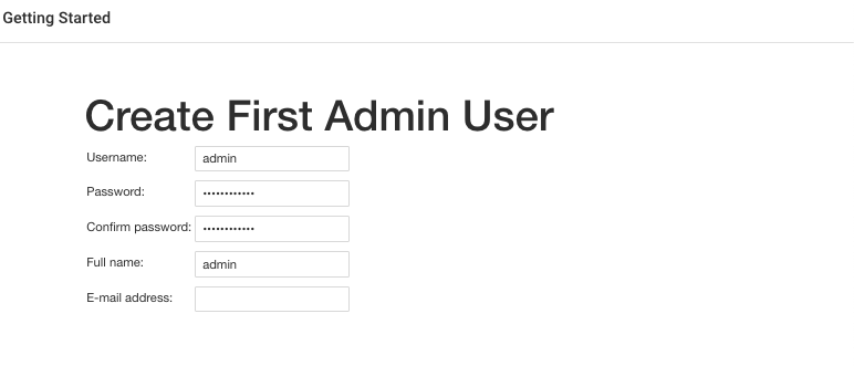 After all the plugins have been installed you will be taken to the "Create First Admin User" page. Enter admin for the "Username" (and "Full name"), enter a password which will be used the Jenkins admin user, and enter a valid email address. Confirm that your screen looks like the image below (with the exception that you entered an email address) and then click on the Save and Continue button.