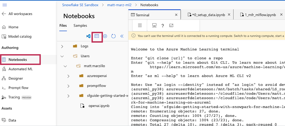 Click on the "Notebooks" blade and open a terminal as shown below.