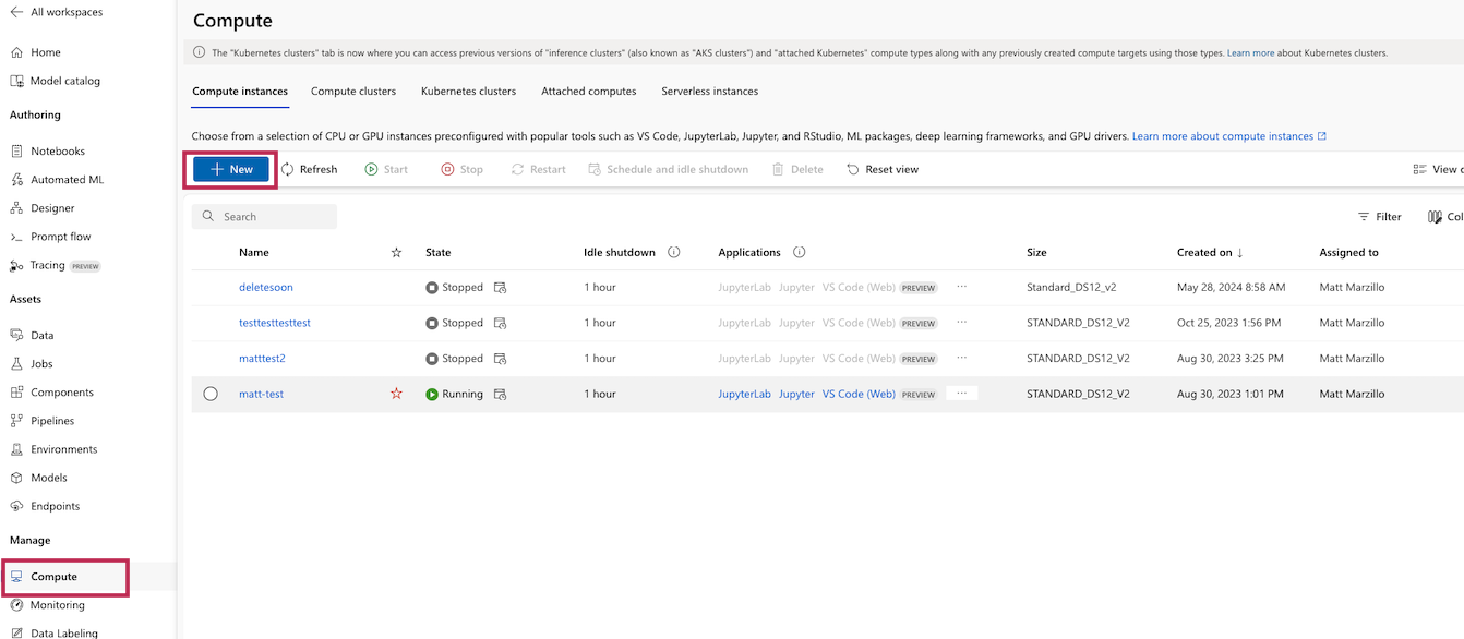 Create a Compute Instance by heading to the Compute tab in AzureML and selecting "New" under the compute instances tab as shown below.