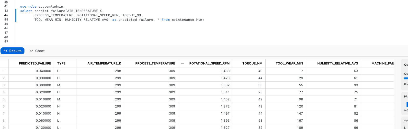 use role accountadmin; select TO_DECIMAL(GET(aml_model!predict_proba(AIR_TEMPERATURE_K, PROCESS_TEMPERATURE, ROTATIONAL_SPEED_RPM, TORQUE_NM, TOOL_WEAR_MIN, HUMIDITY_RELATIVE_AVG), 'output_feature_1'), 38, 4) as predicted_failure, * from maintenance_hum;