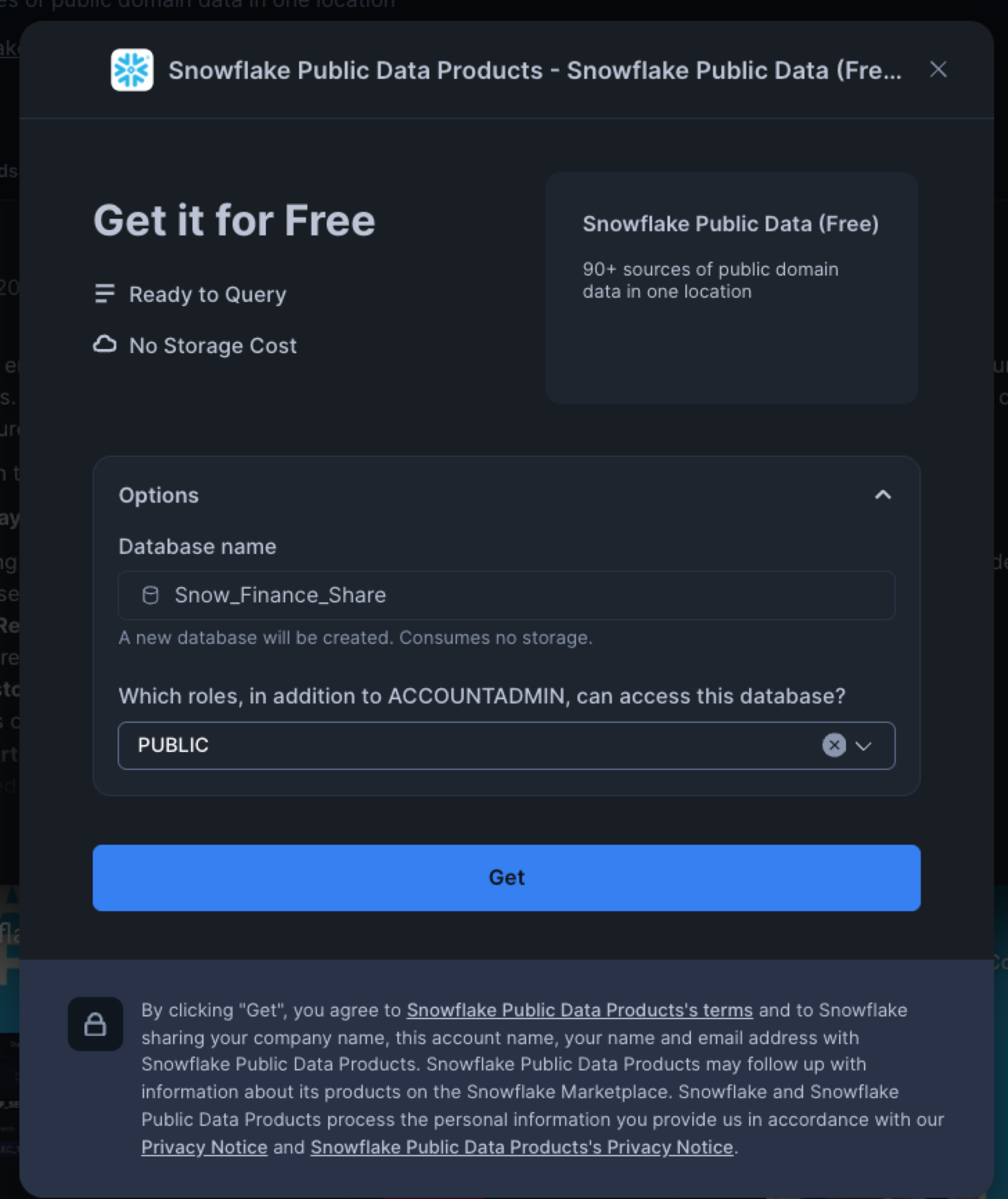 - Click "Get" to mount this free share as a database named "Snow_Finance_Share"