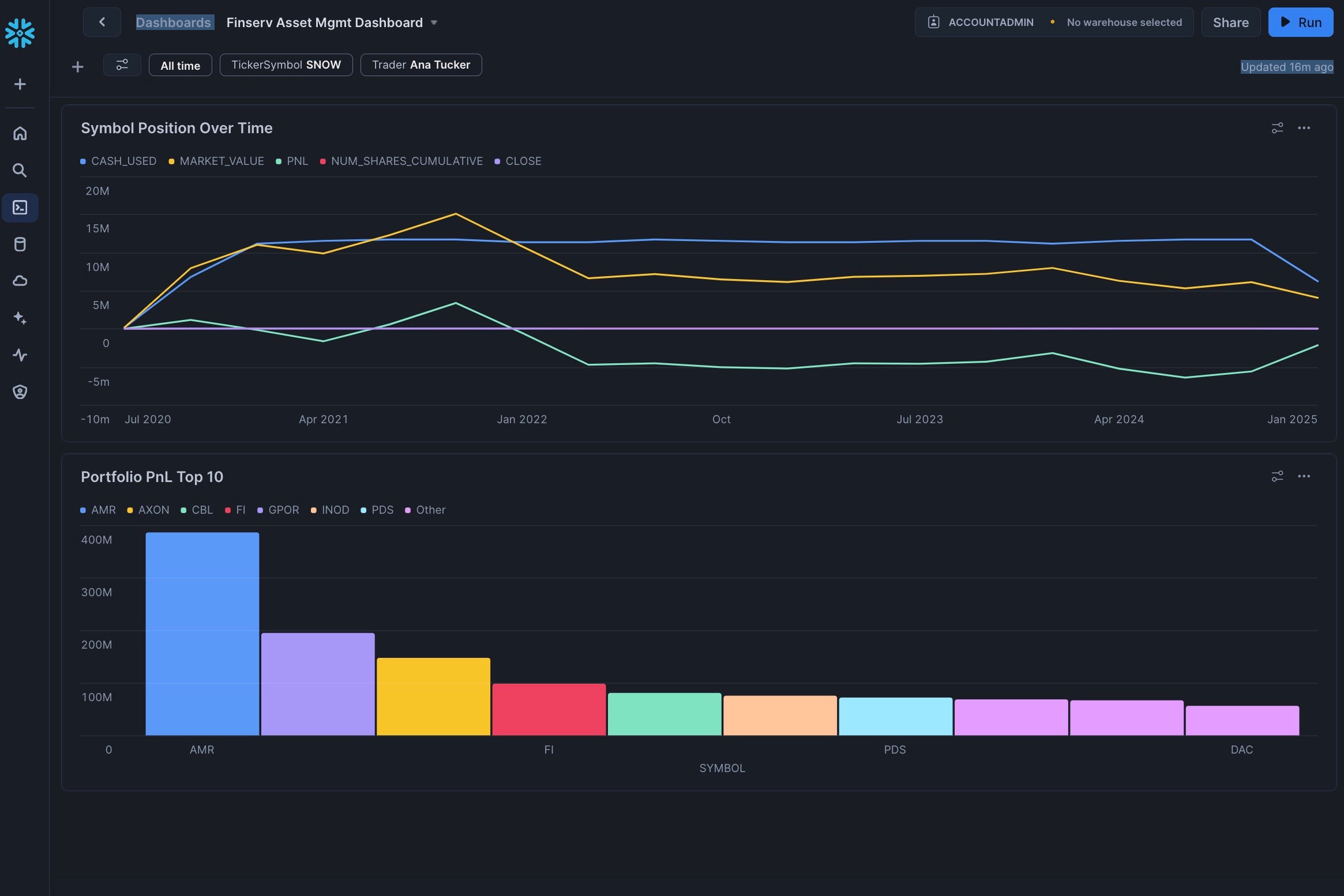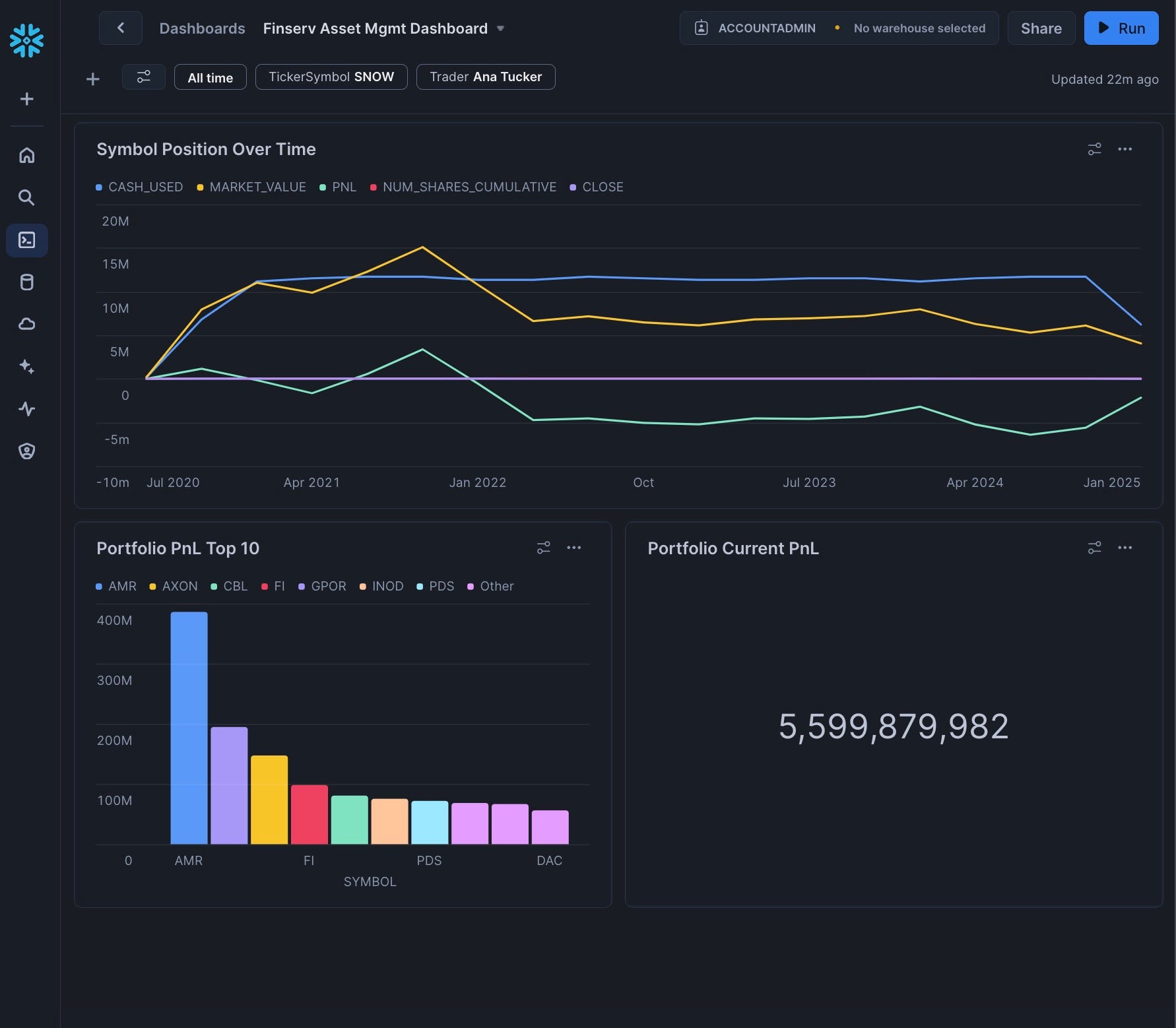 In this guide, you'll build a Financial Services Asset Management demo in Snowflake that scales to handle 3 billion synthetic trades while providing real-time cash and profit/loss calculations. You'll learn how to leverage Snowflake's unique architecture to scale compute resources up and down as needed, create a dashboard for monitoring positions, and implement DevOps practices like zero-copy cloning and time travel.