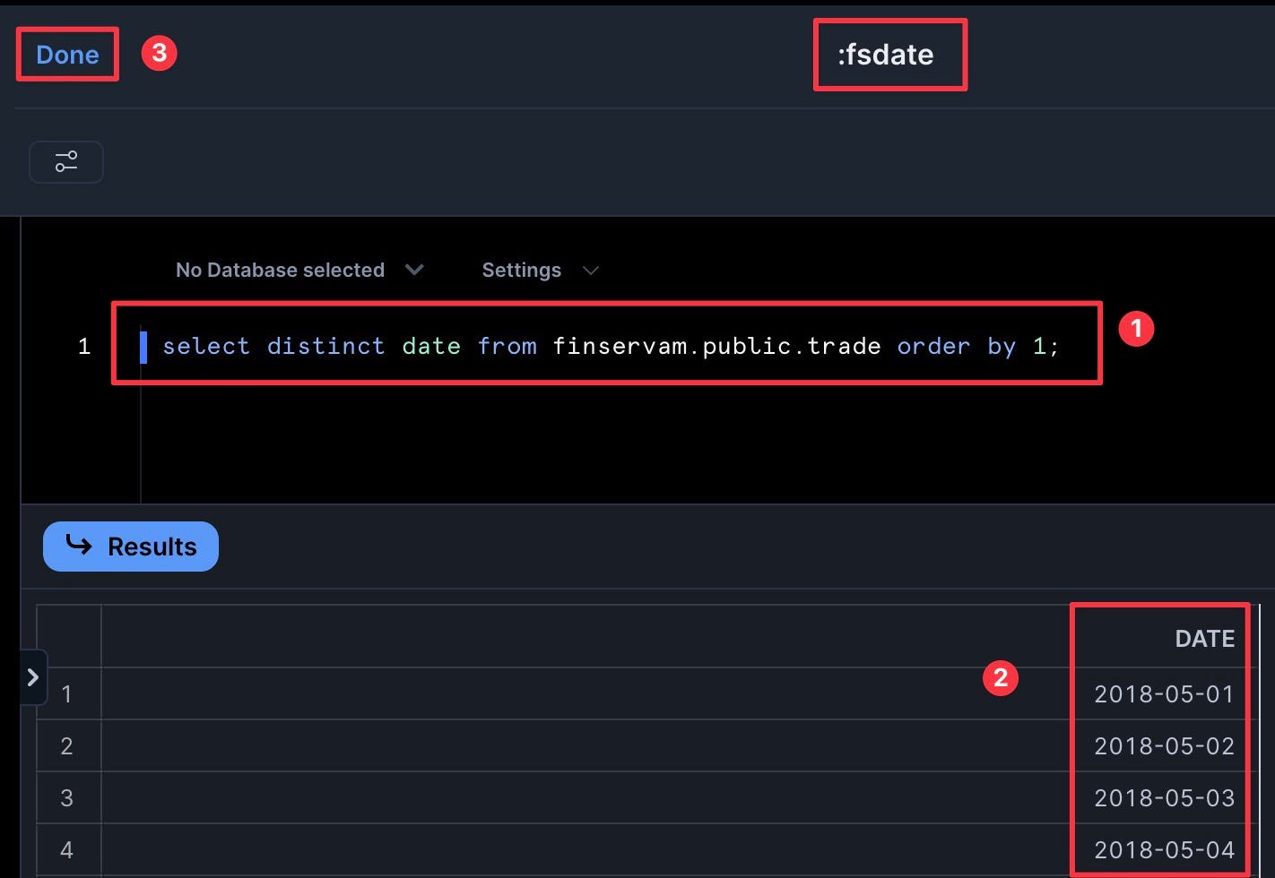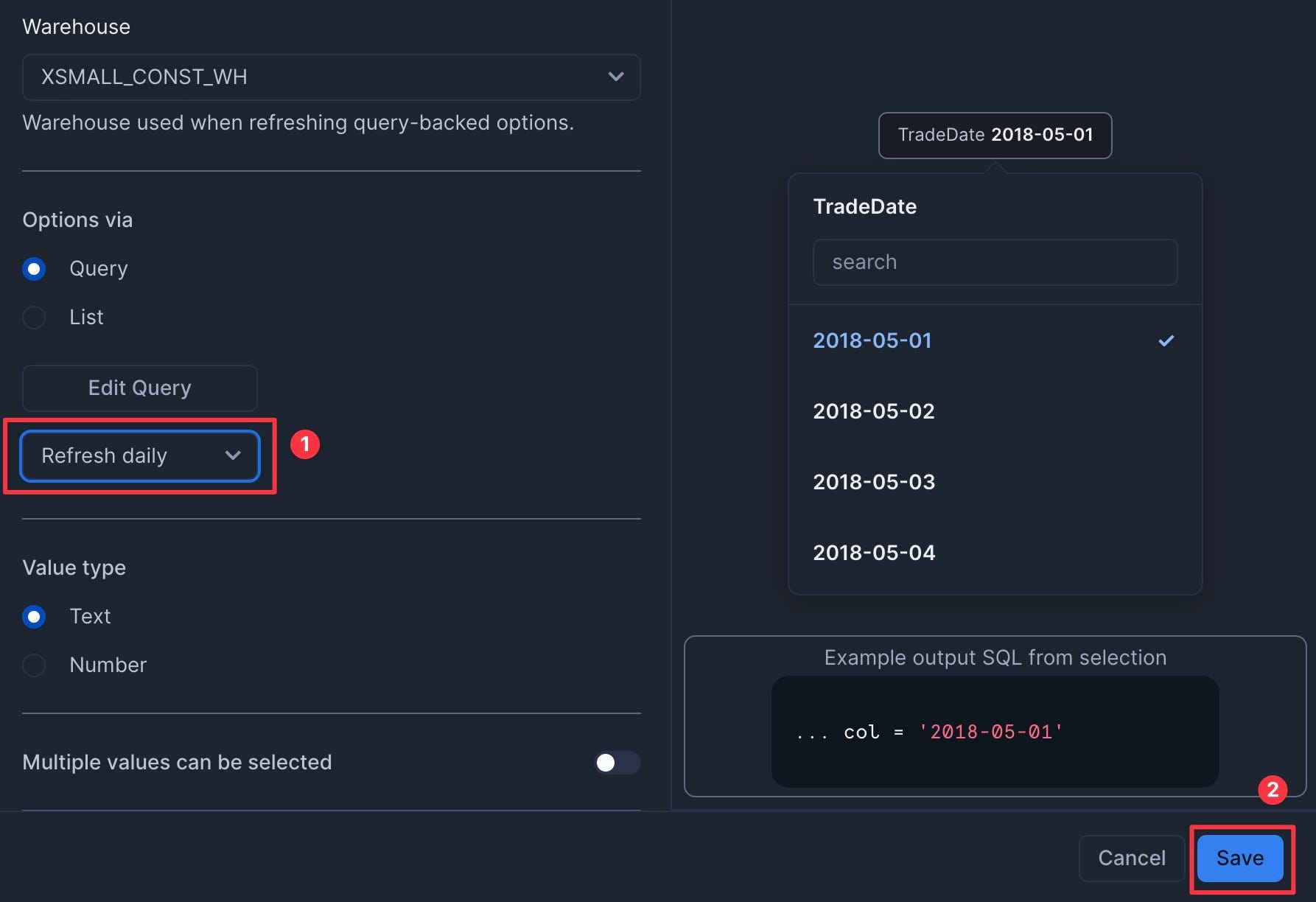 select distinct date from finservam.public.trade order by 1; - Set to refresh daily to save credits. Then click Save.