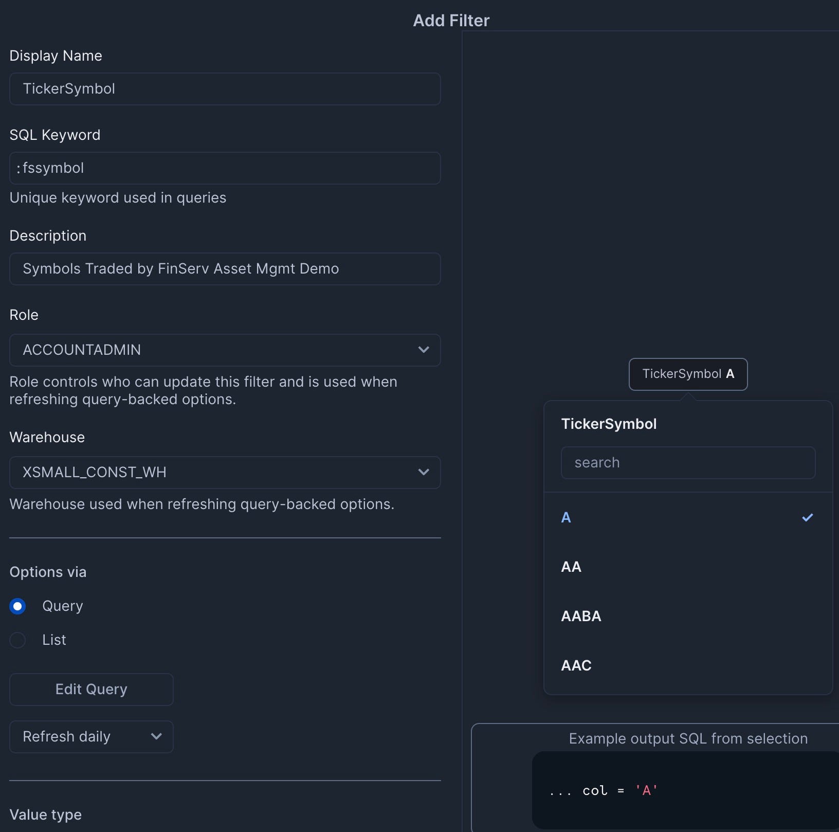 - Add a filter named "TickerSymbol" with the following settings:
