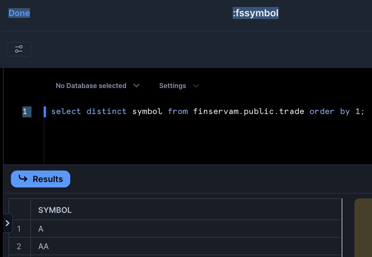 select distinct symbol from finservam.public.trade order by 1; - Set to refresh daily