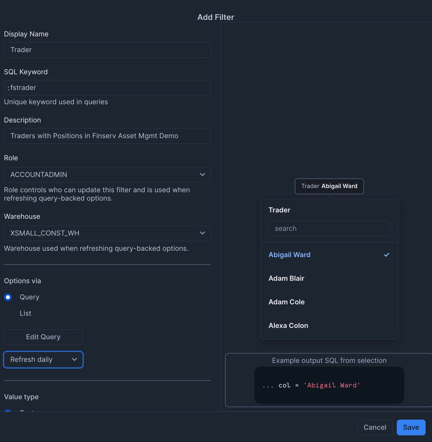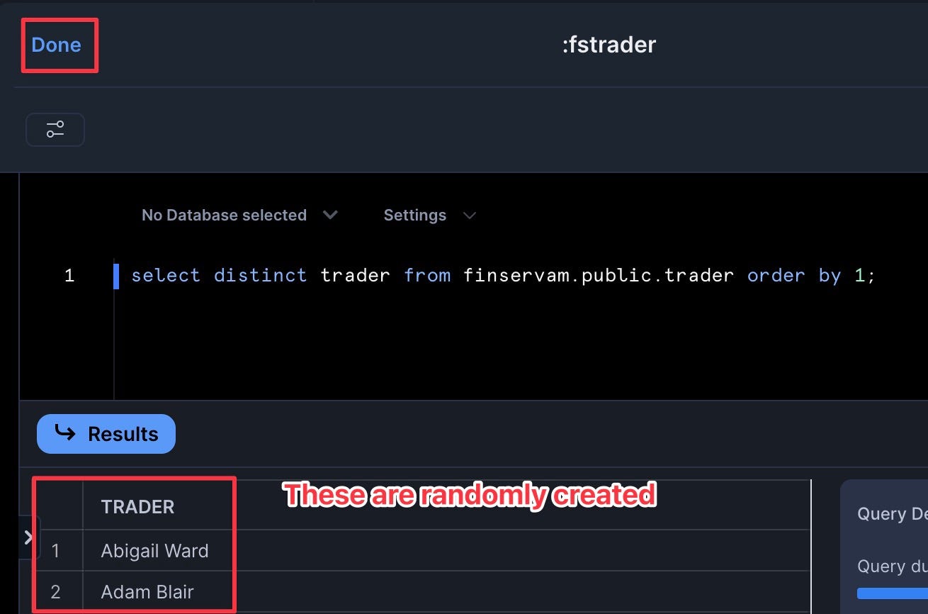 select distinct trader from finservam.public.trader order by 1; - Set to refresh daily