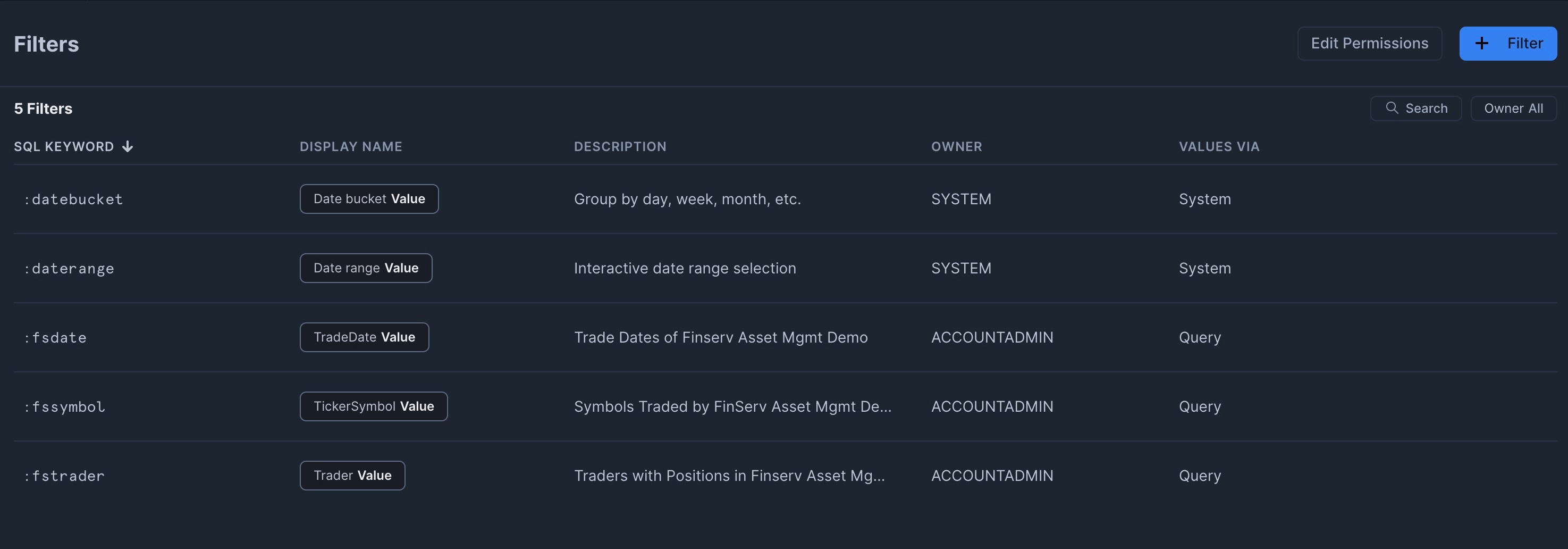 When complete, you should have three custom filters plus the two Snowsight system filters.