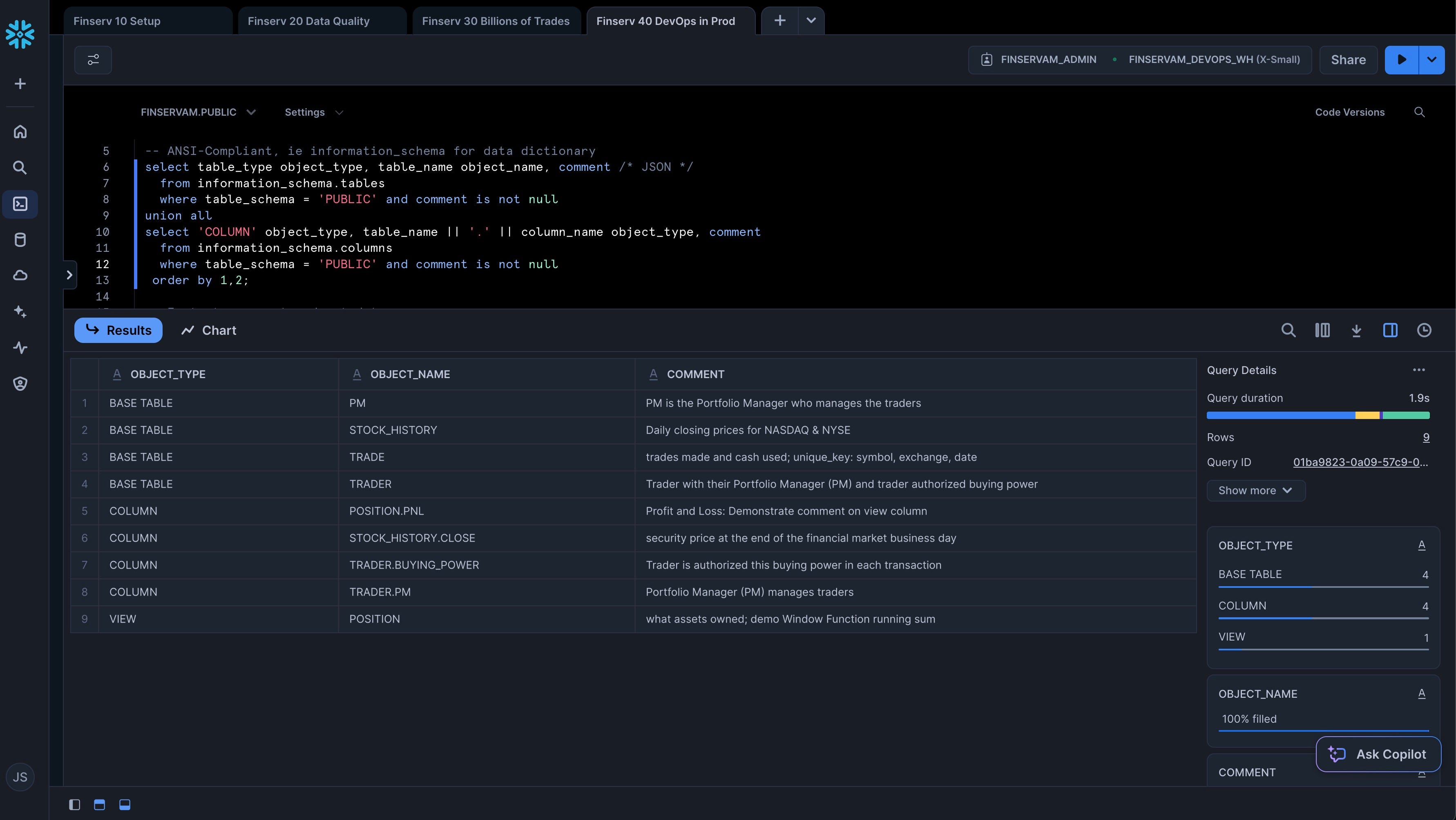-- Context use role finservam_admin; use warehouse finservam_devops_wh; use schema finservam.public; alter warehouse finservam_devops_wh set warehouse_size = 'xsmall'; -- ANSI-Compliant, ie information_schema for data dictionary select table_type object_type, table_name object_name, comment /* JSON */ from information_schema.tables where table_schema = 'PUBLIC' and comment is not null union all select 'COLUMN' object_type, table_name || '.' || column_name object_type, comment from information_schema.columns where table_schema = 'PUBLIC' and comment is not null order by 1,2; -- Instant rowcount and metadata show tables like 'trade'; -- Let's format that rowcount set q = last_query_id(); select "rows", TO_VARCHAR("rows", '999,999,999,999') "pretty_rowcount" from table(result_scan($q));