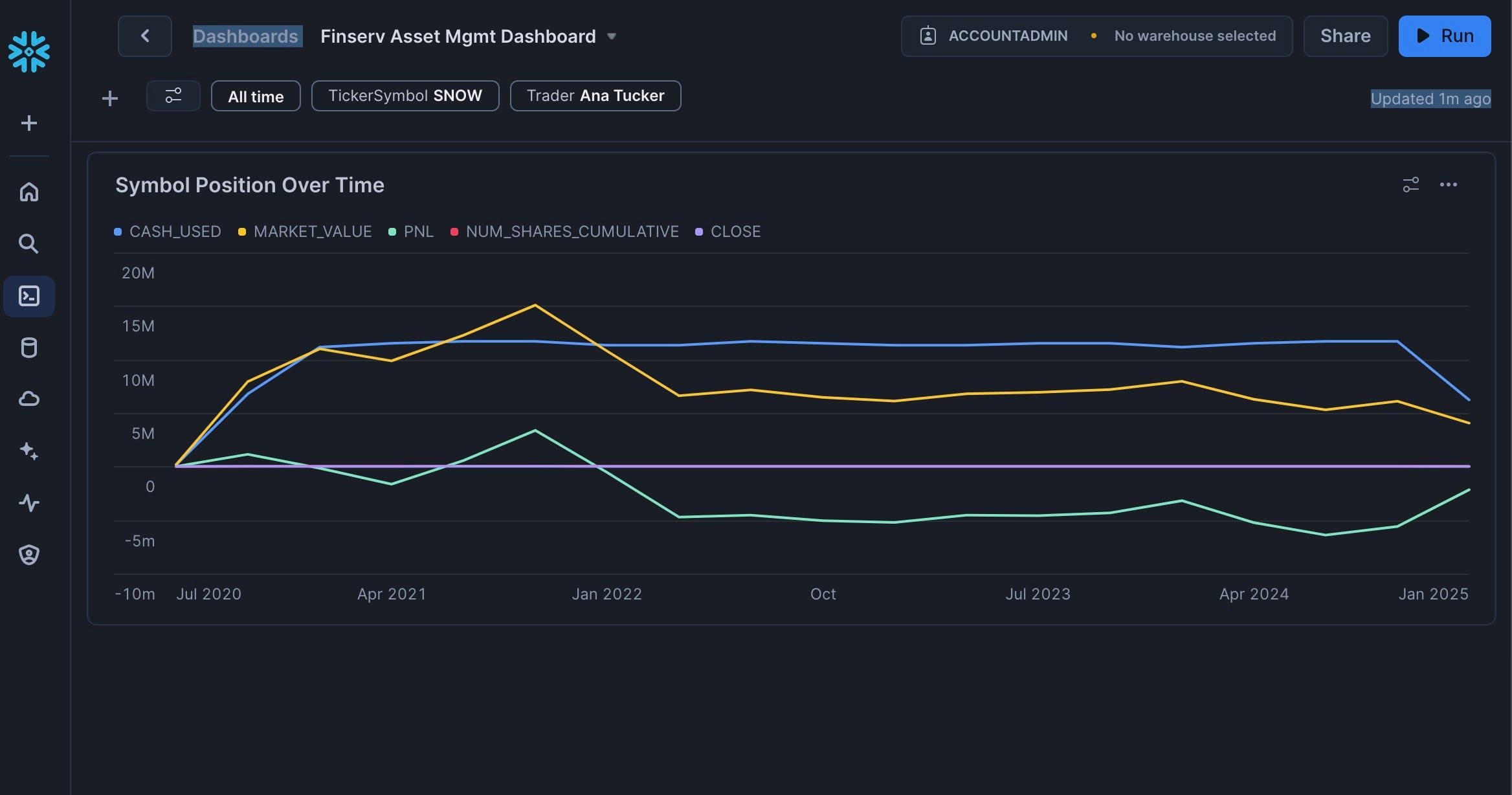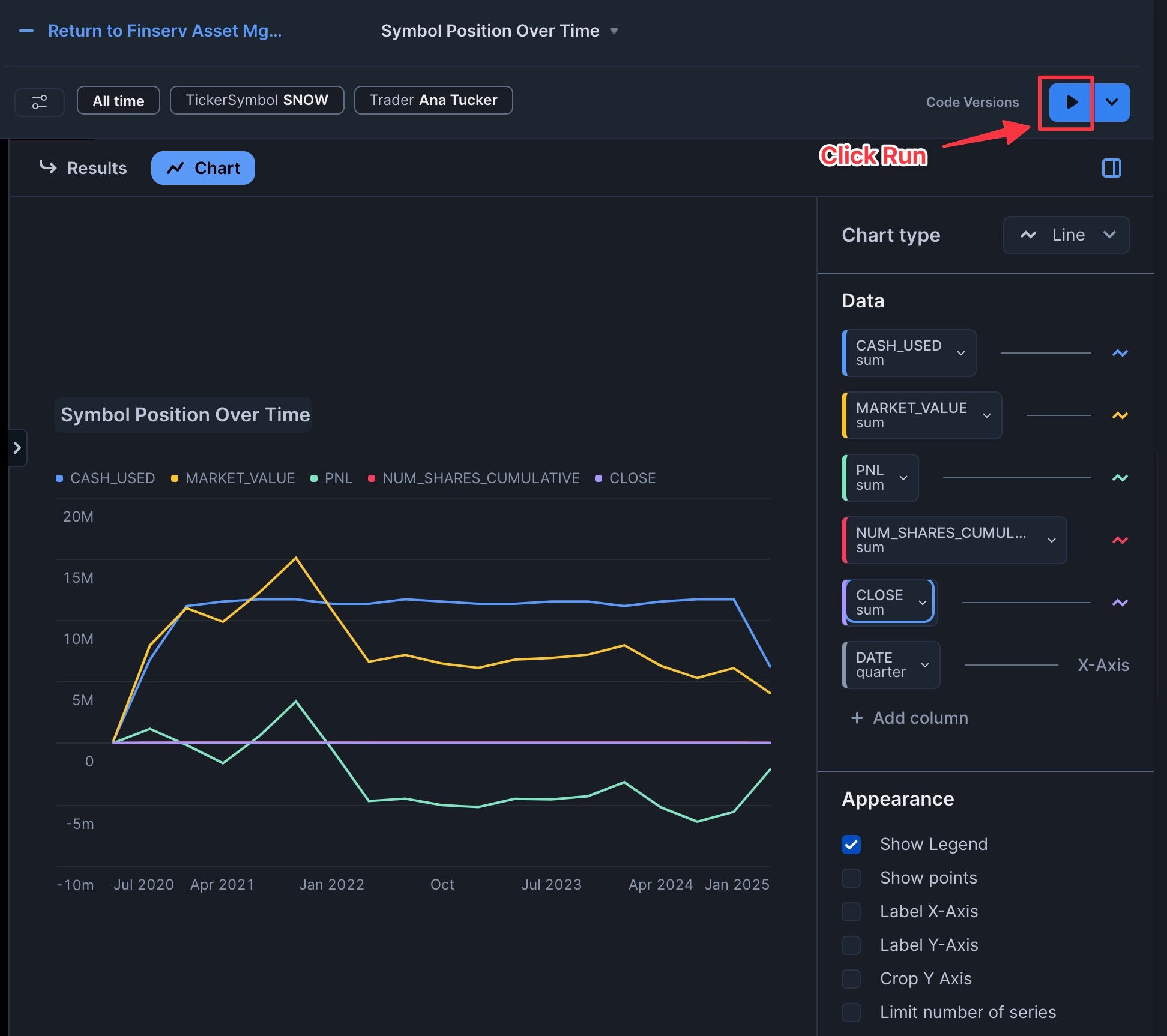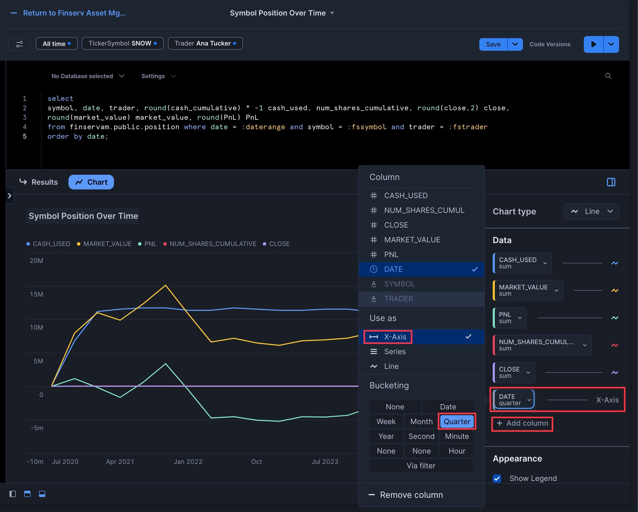 - Add the five other columns (cash_used, num_shares_cumulative, close, market_value, PnL) with "Use As" set to "Line" and "Aggregation" set to "Sum"