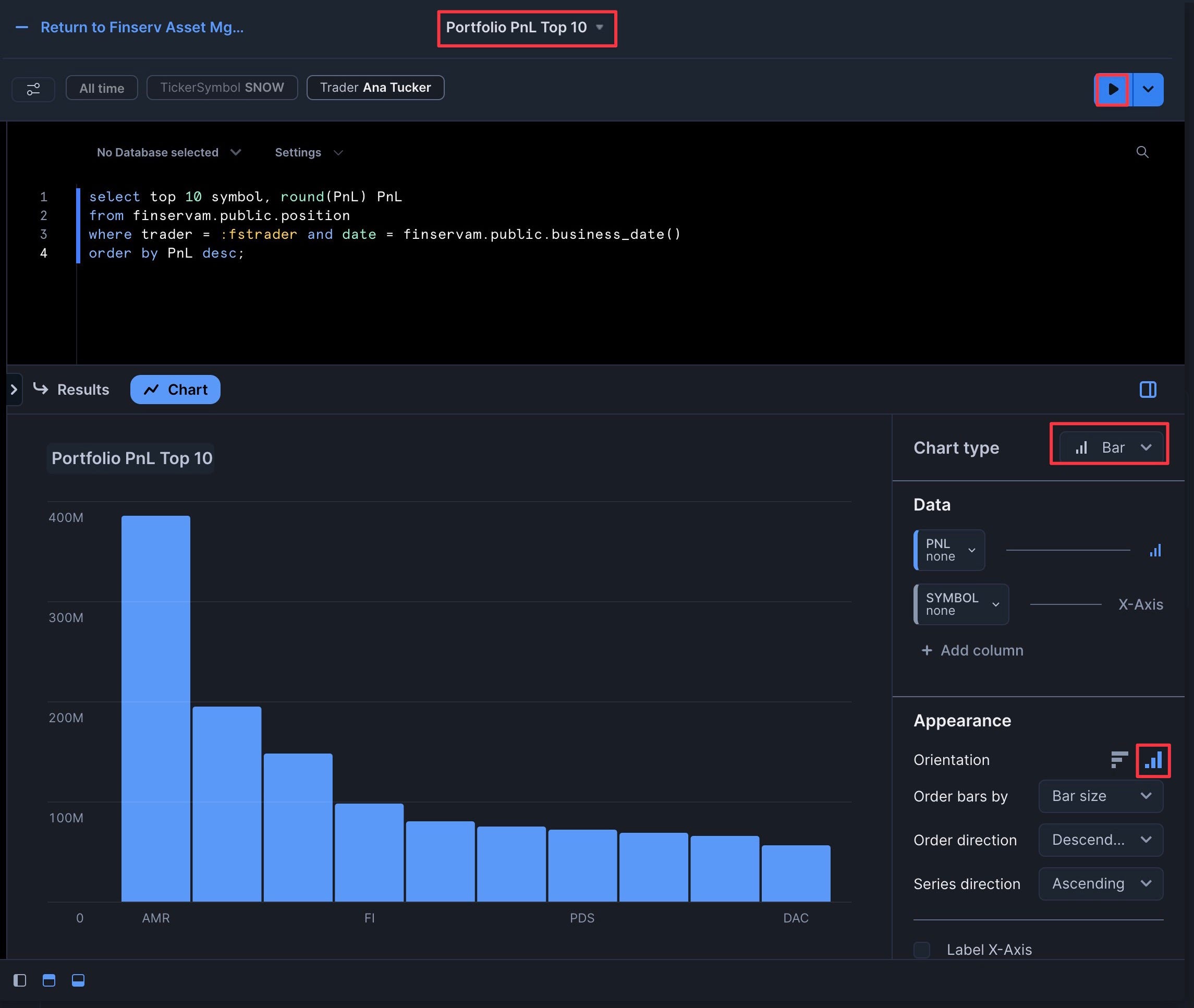 select top 10 symbol, round(PnL) PnL from finservam.public.position where trader = :fstrader and date = finservam.public.business_date() order by PnL desc;