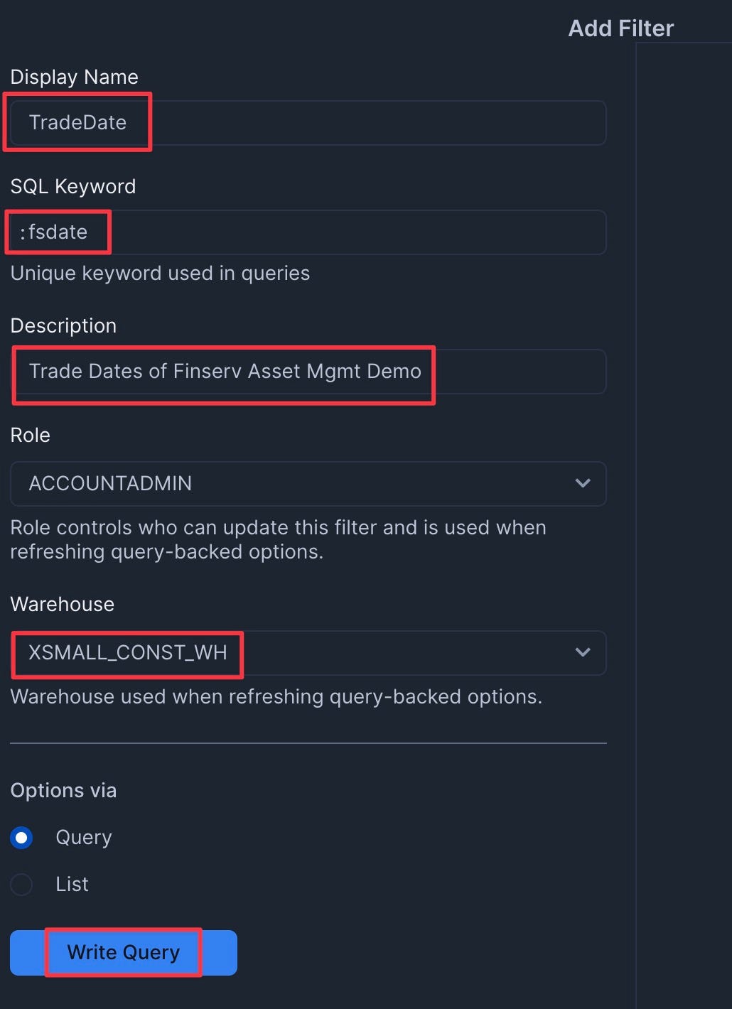 - Add a filter named "TradeDate" with the following settings: