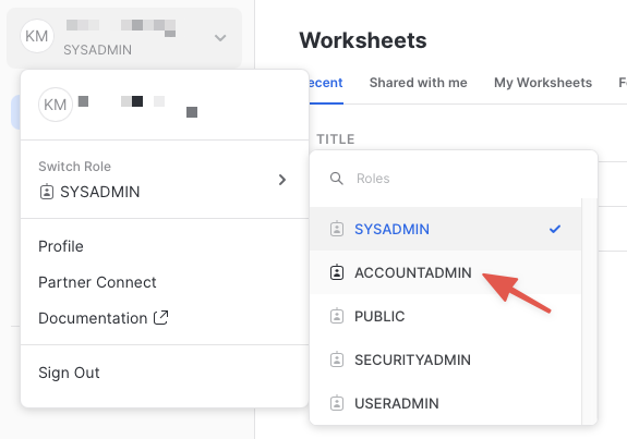 The Snowflake web interface has a lot to offer, but for now, switch your current role from the default SYSADMIN to ACCOUNTADMIN. This increase in permissions will allow you to create shared databases from Snowflake Marketplace listings.