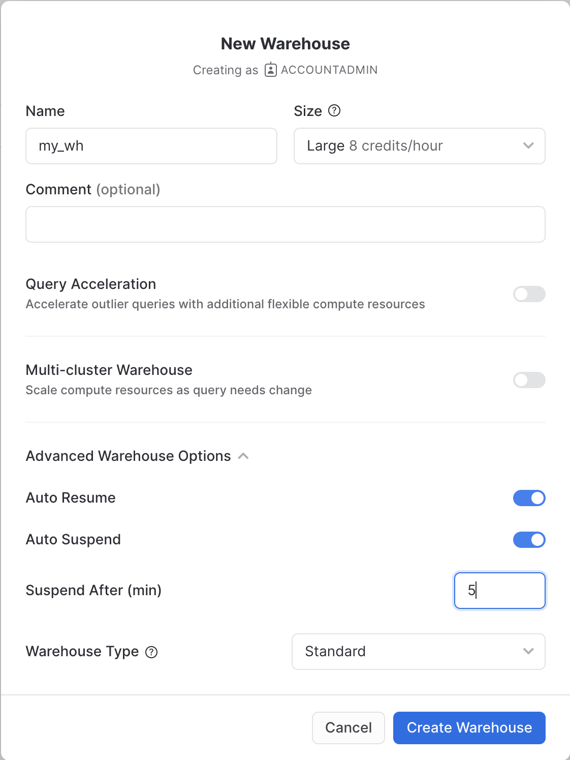 + Warehousebutton in the upper right of the window - Create a LARGE Warehouse as shown in the screen below