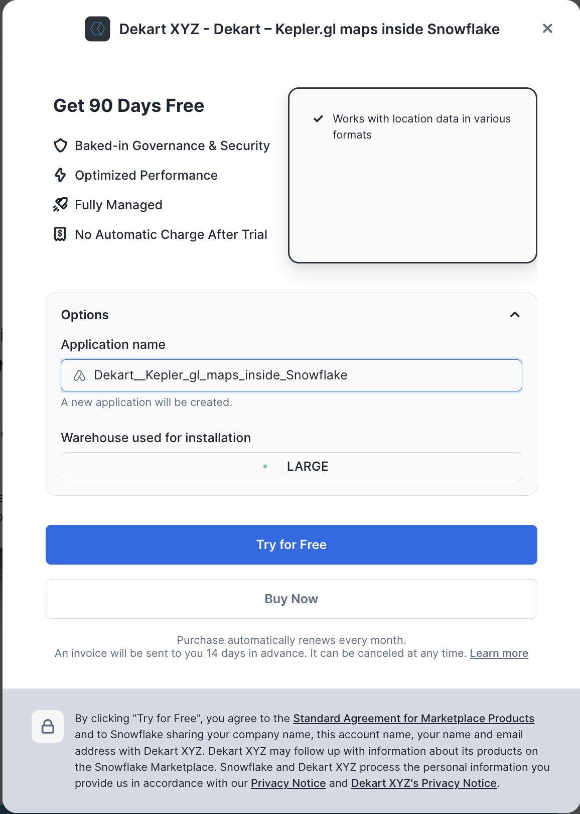 Dekart – Kepler.gl maps inside Snowflakein the search bar - Once in the listing, click the big blue