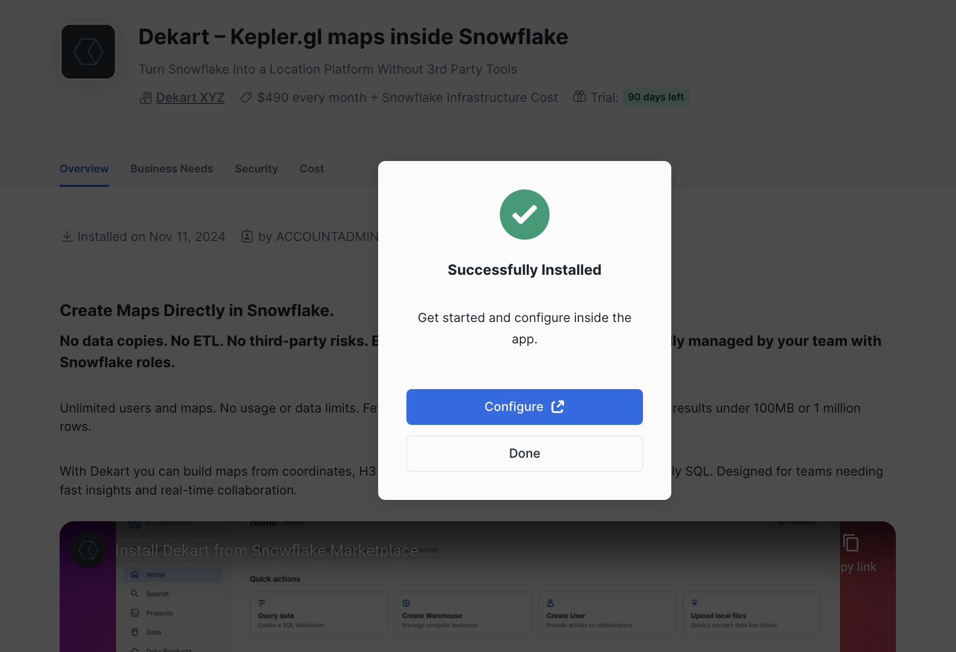 Grant Account Privileges to Dekart and allow connections to the Mapbox API. Dekart uses Mapbox for rendering maps. No user data is sent to Mapbox. Dekart creates a single node CPU_X64_XS compute pool and XSMALL warehouse.
