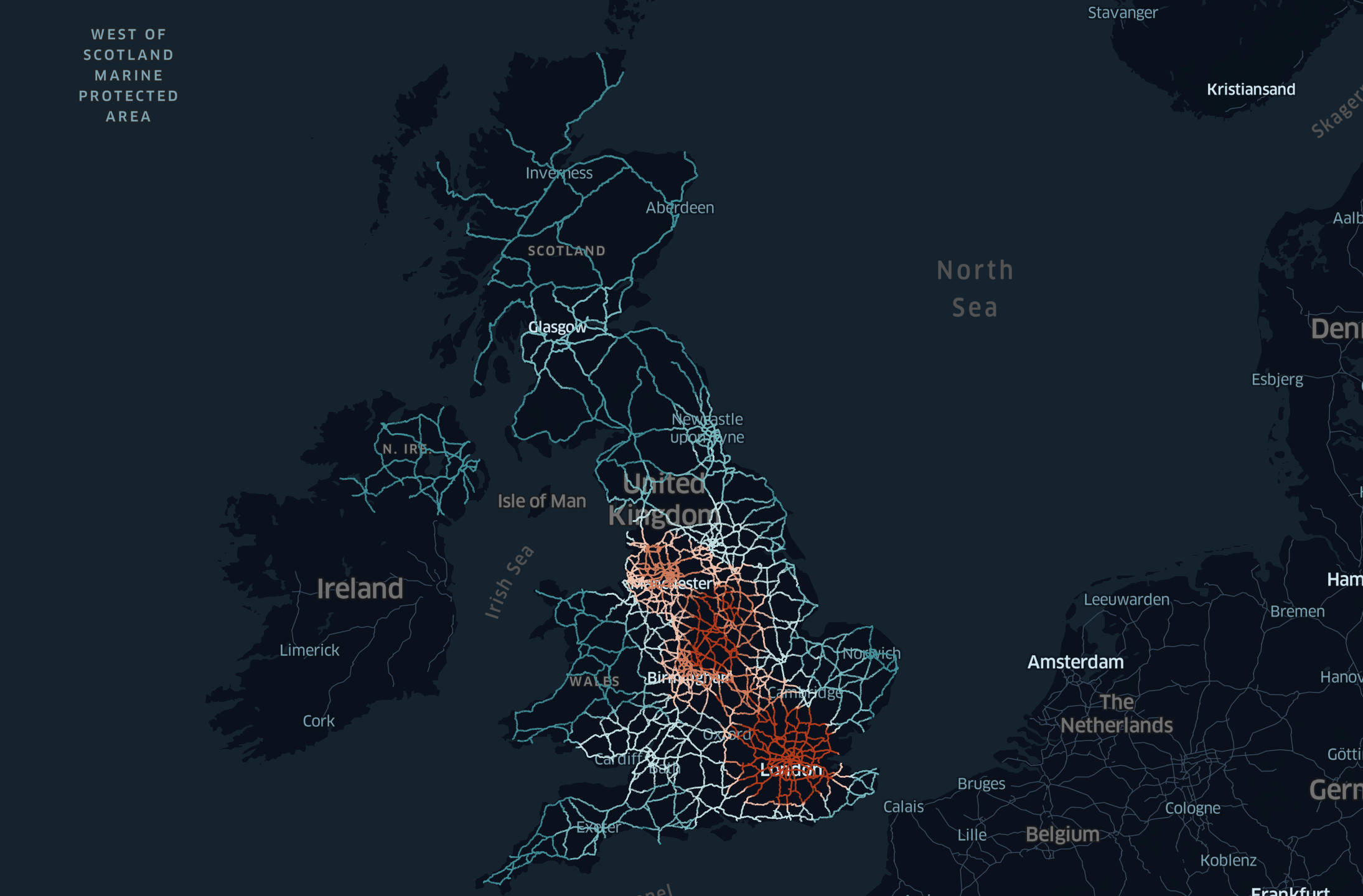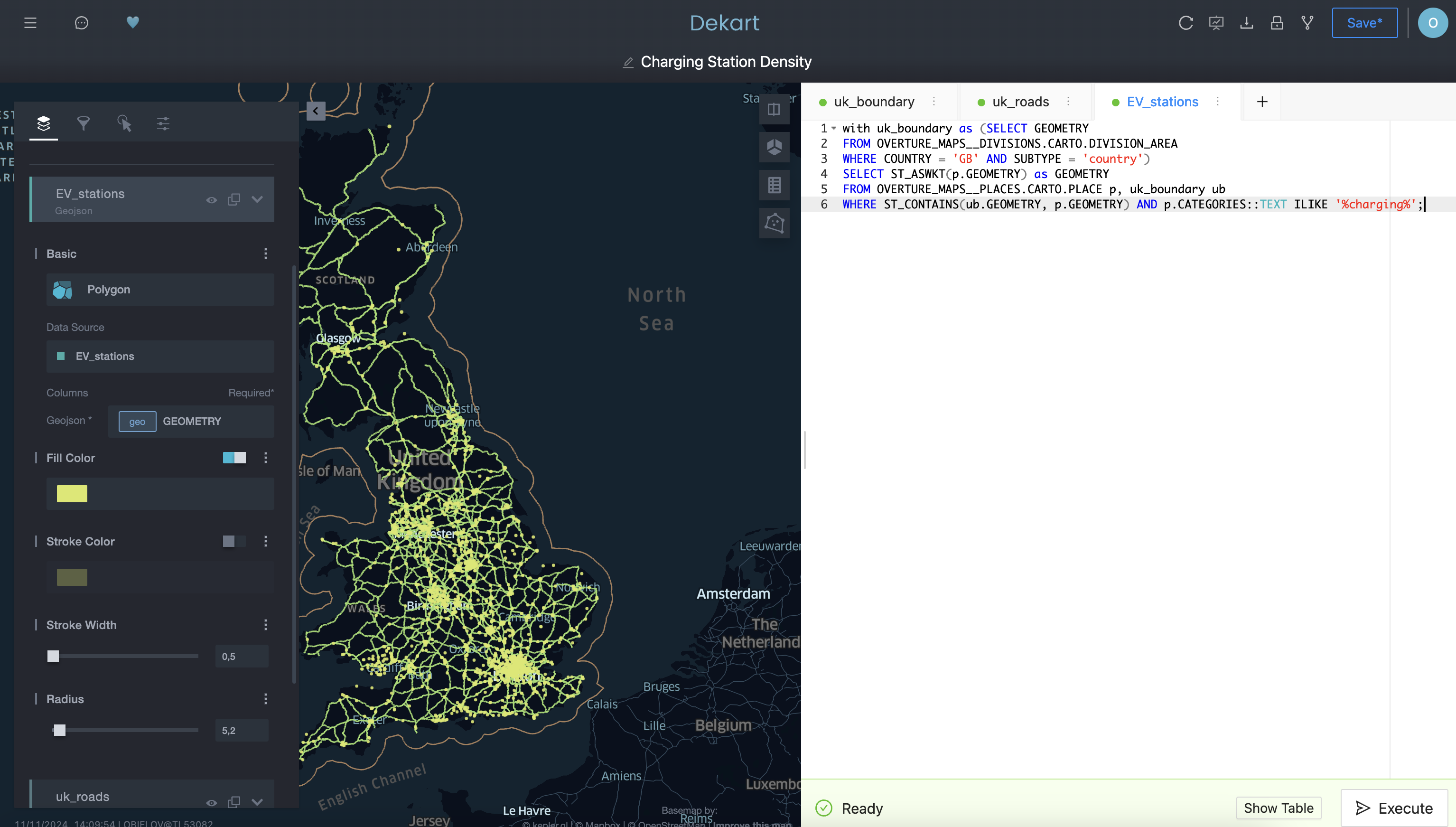 In this Lab you will learn how to create interactive maps directly within Snowflake using Kepler.gl, powered by Dekart.xyz. You will use Dekart.XYZ app and use public datasets from Marketplace to visualize UK highways with color-coded density of nearby EV charging stations.