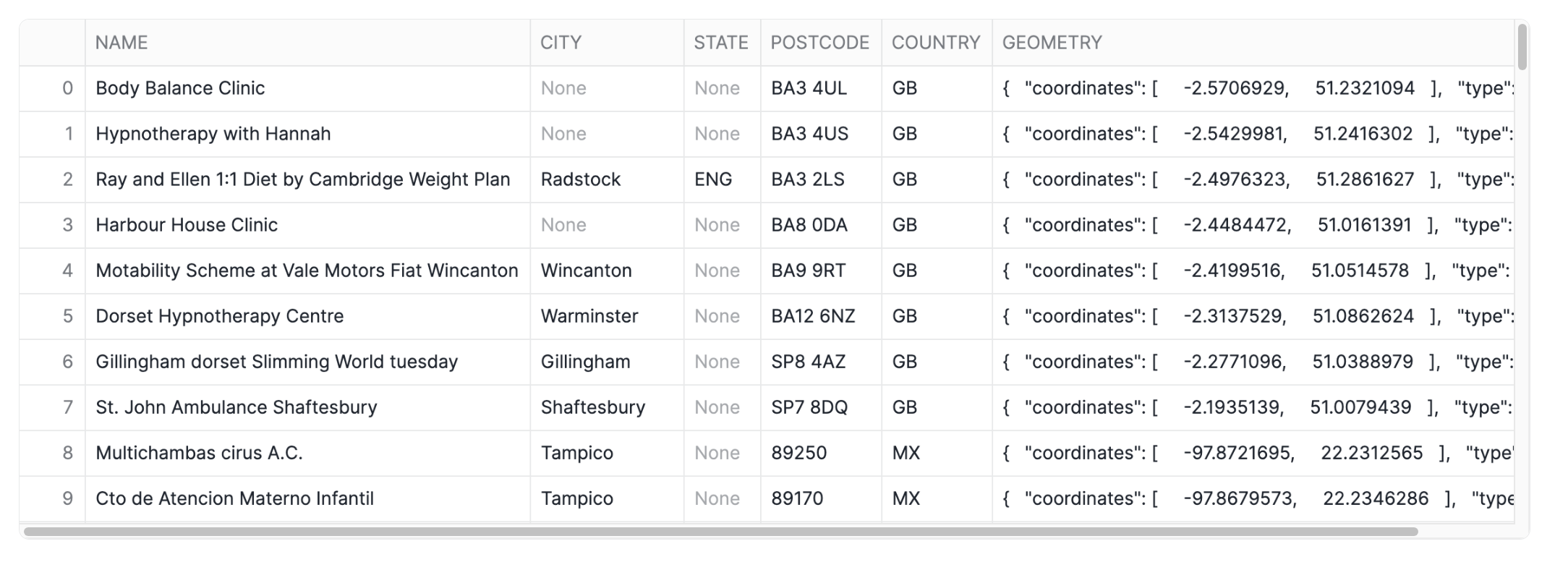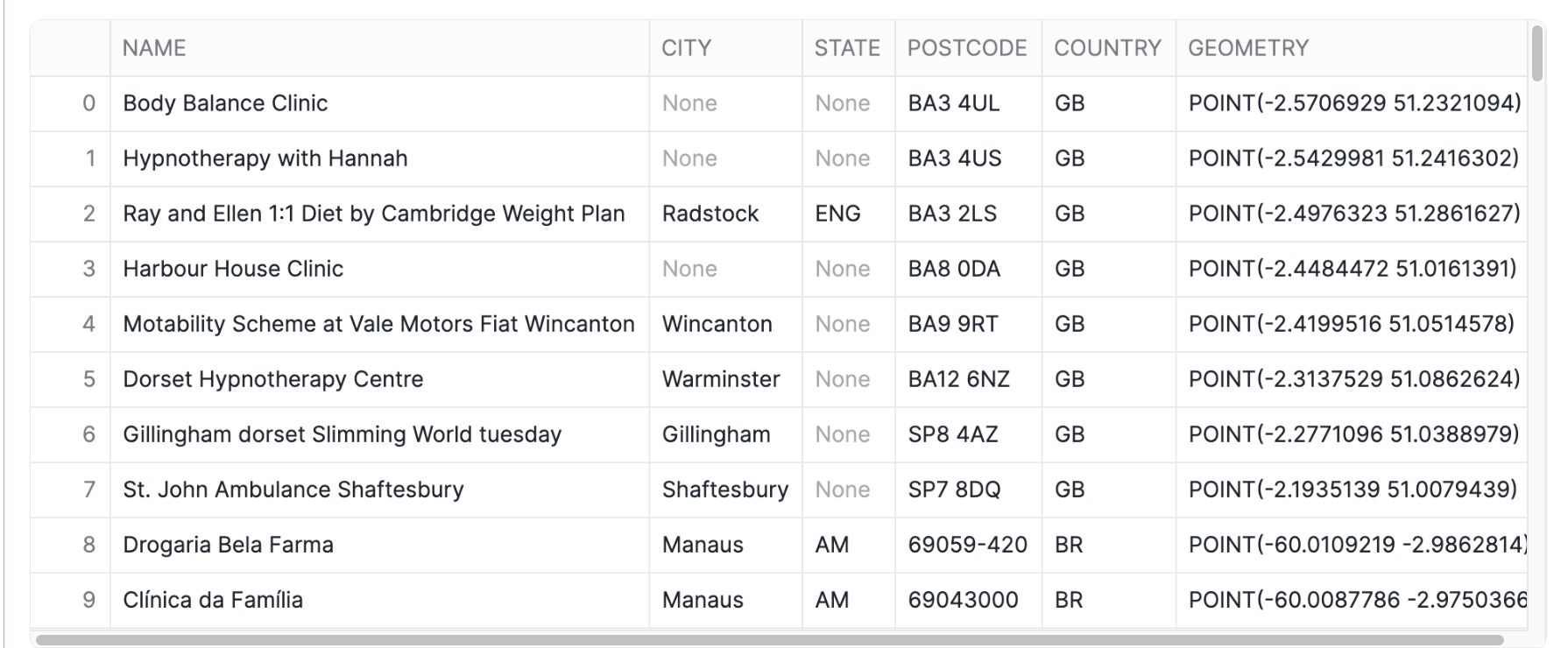 SELECT NAMES['primary']::STRING AS NAME, ADDRESS.value:element:locality::STRING AS CITY, ADDRESS.value:element:region::STRING AS STATE, ADDRESS.value:element:postcode::STRING AS POSTCODE, ADDRESS.value:element:country::STRING AS COUNTRY, geometry FROM OVERTURE_MAPS__PLACES.CARTO.PLACE, LATERAL FLATTEN(INPUT => ADDRESSES:list) AS ADDRESS WHERE CATEGORIES['primary'] ='health_and_medical' LIMIT 100;