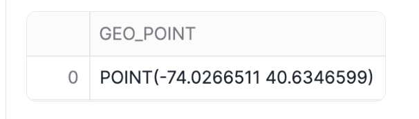 SELECT TO_GEOGRAPHY('POINT(-74.0266511 40.6346599)') GEO_POINT
