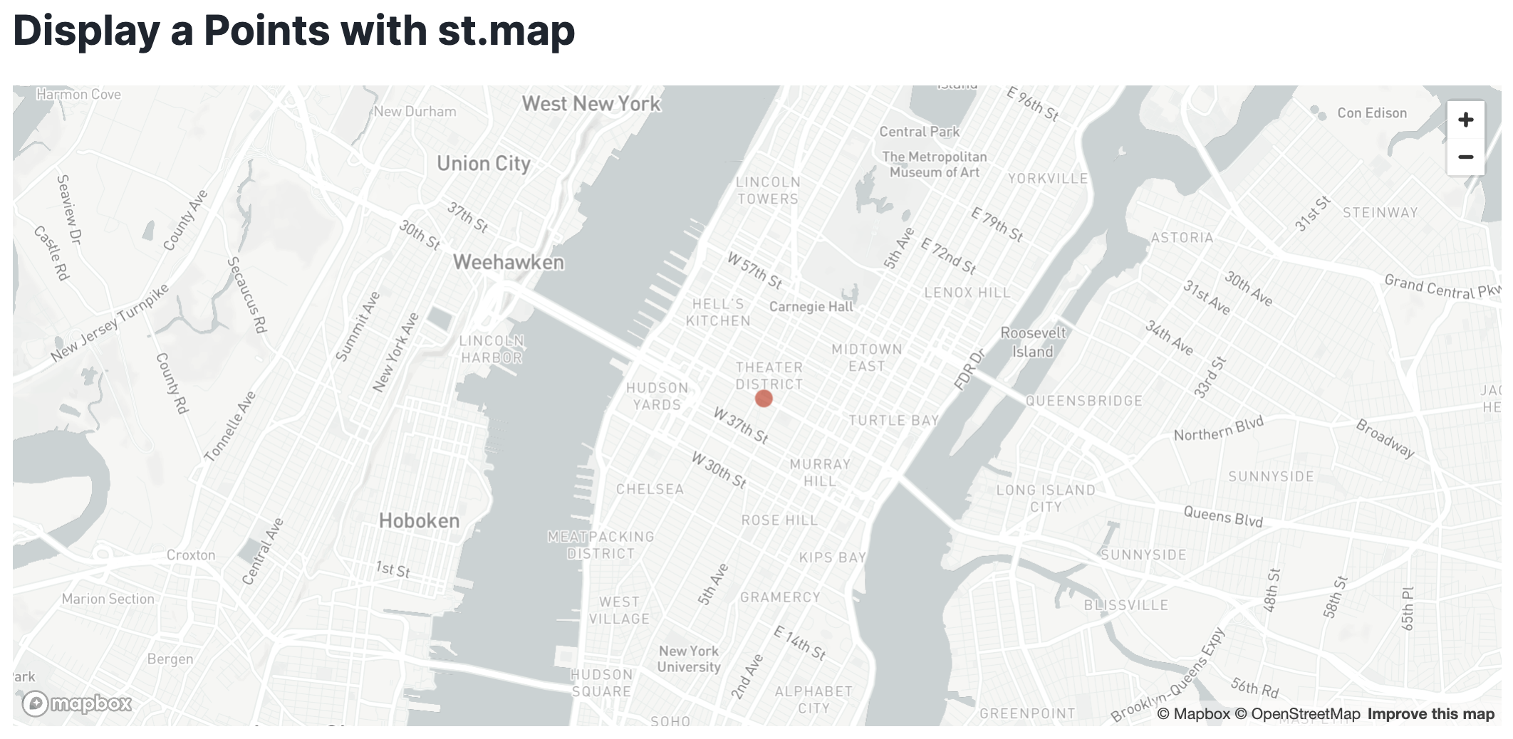 import streamlit as st import pandas as pd # Define the coordinates for the point latitude = 40.755702 longitude = -73.986226 # Create a DataFrame with the point data = pd.DataFrame({ 'lat': [latitude], 'lon': [longitude] }) # Display the map with the point st.title("Display a Points with st.map") st.map(data)